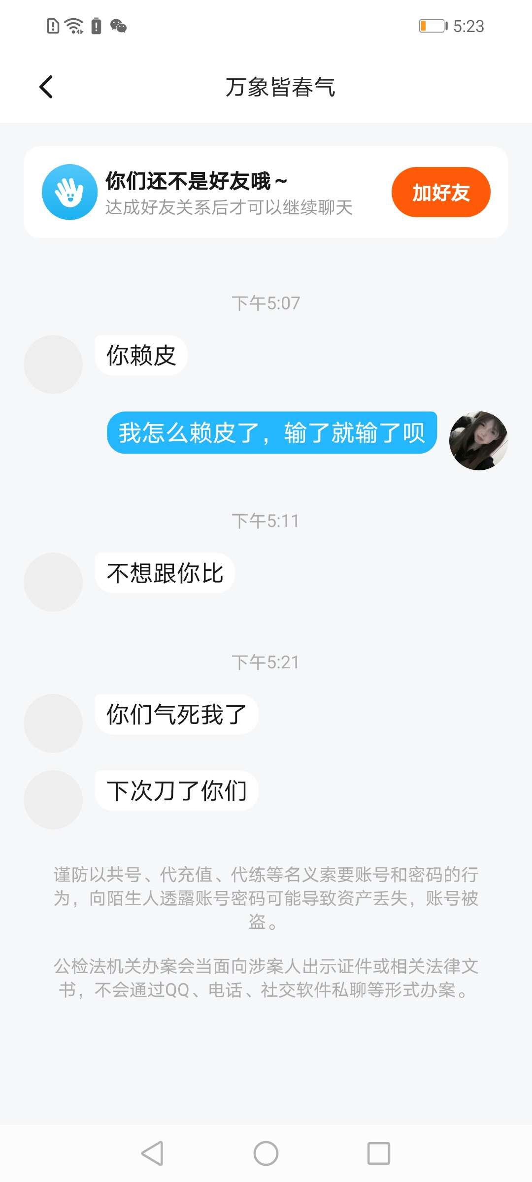 大家帮我说一下他,起因是这样的:他和另一个人机当了我们的对手,后面又说鱼不吃鱼,你就乖乖认输吧。然后开局了他们输了又在那里说,我们骂我们,我和我队友也在骂回去,然后他就说气死了,然后我们又开了一局,对面还是那两个人机,玩到中途他们要输了又在那里说不公平,还说只要是他们输了就不公平,真的笑死好吧,大家一定要去举报他