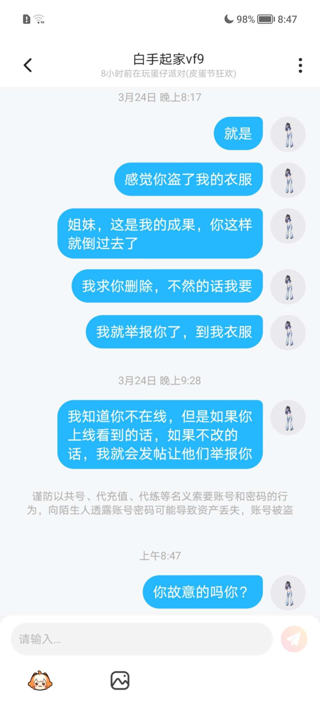无语了,就是就是,不小心加了一个好友,他就看了我的人设,就把我的倒过去了,我自己辛辛苦苦捏了那么久的脸,为什么为什么?他故意的,他上线看见我消息也不改大家就不能帮忙举报一下吗?