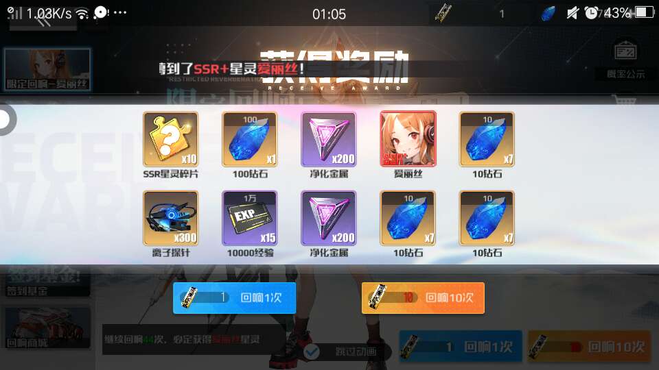 没保底的第二个十连抽中了SSR+爱丽丝