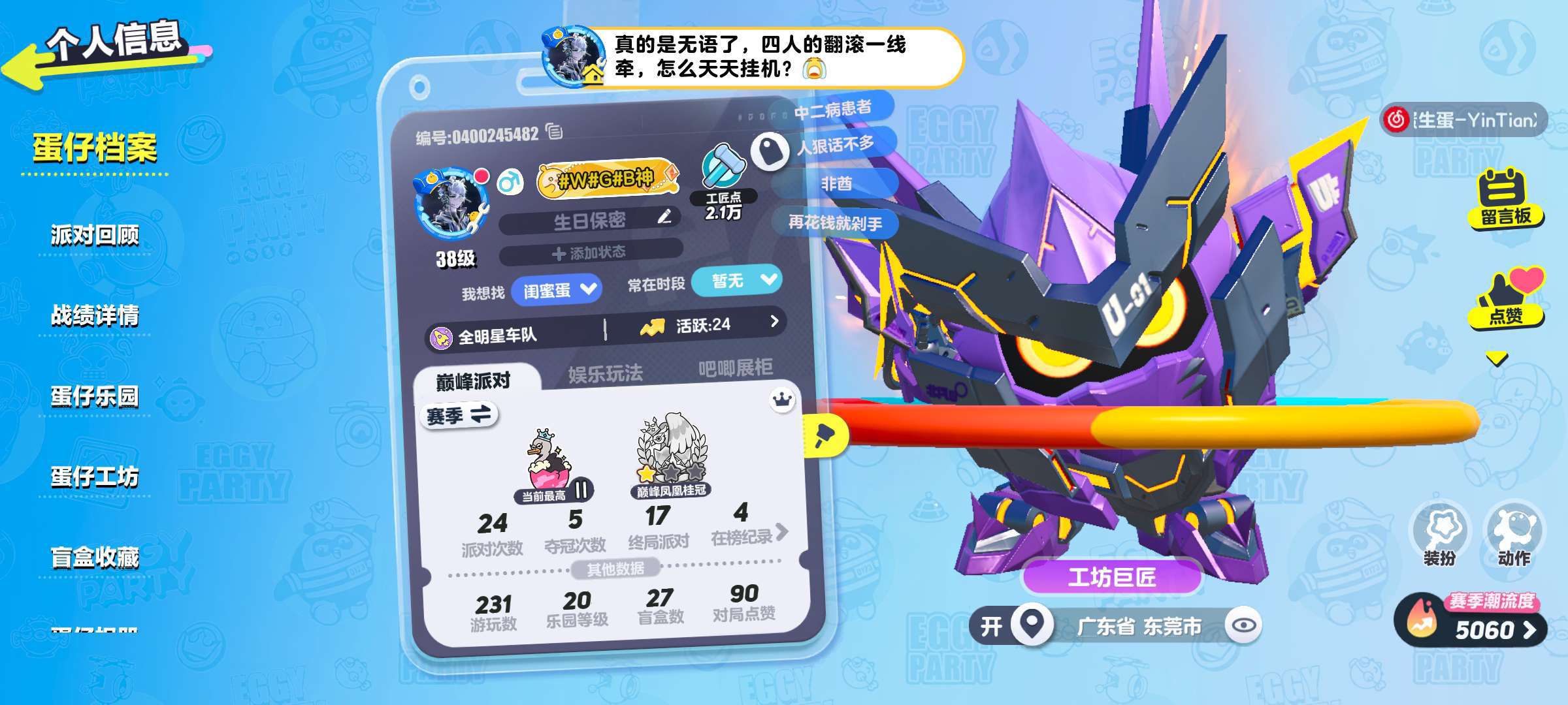 就是我在玩的时候,这个贾玲我选了个仔仔熊,然后呢我也没什么问题,然后呢第二局他有大招时到了决赛对面只有一个人,然后呢我也伤害很高。对于来说是我能赢的,结果他一个跳步给我送到毒圈外面,而且还用言语嘲讽我们。大家帮我举报一下。也不想自己去遇到这种人净化蛋仔岛