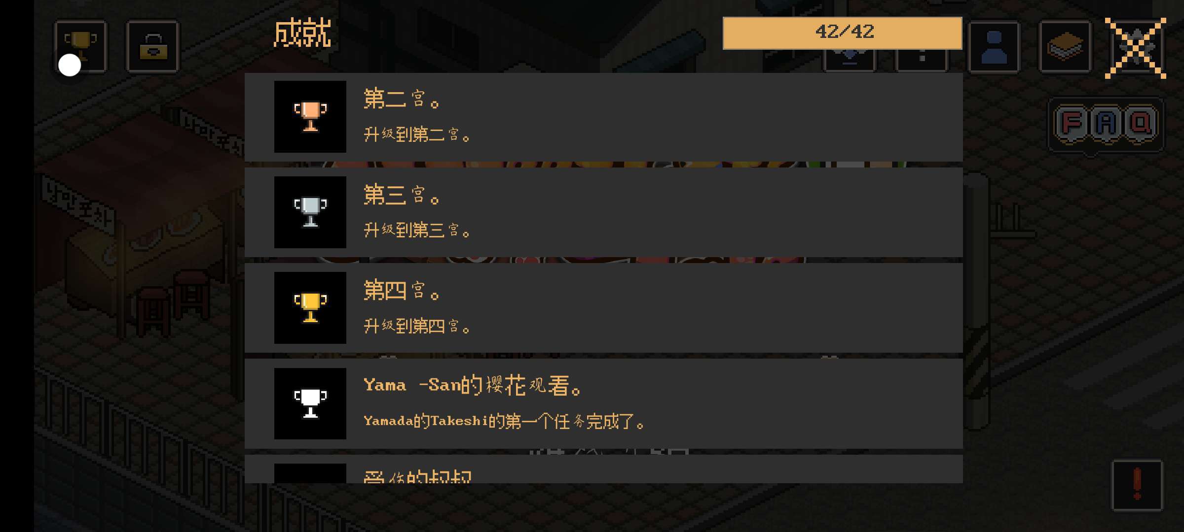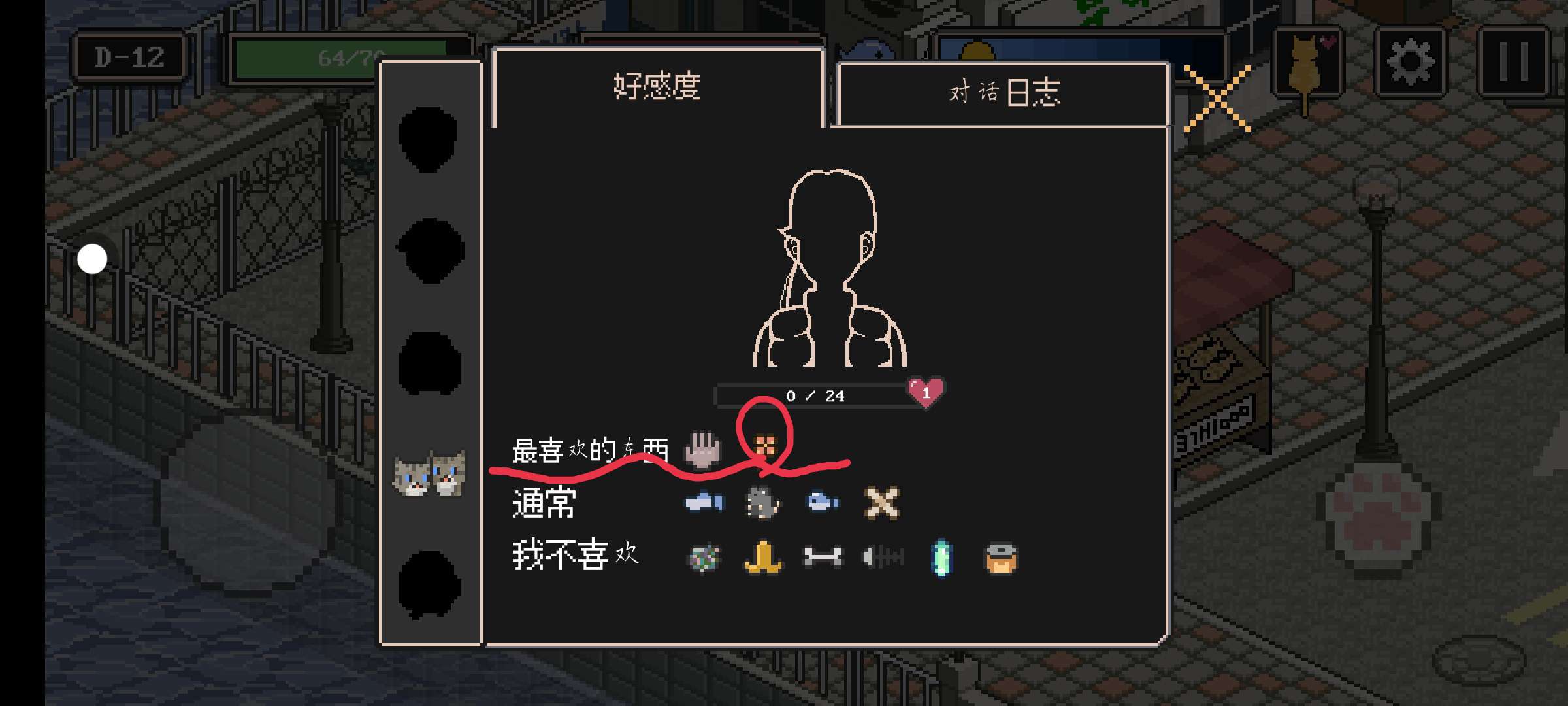 首先,你有大约12到13天的时间。如果到这你还没有达成七级亲密度的NPC,就会达成成就五-孤独。最开使时我建议先建小窝,到后面每人每天可以有三次对话 ,而且血量和健康也会增加。解锁完全成就 ,点开这个。会出现这个界面,每个NPC都能对话 。这个翻译不行 ,我简单说下我知道的,猫可以是猫罐头,宁根大概是指人?Npc老板,正确翻译应该是老大。NPC鲭鱼和姐姐,之前翻译是雀斑和点点 。那只老白猫,翻译应该是老猫。那只狗狗,pochi之前翻译是多哥。会给你罐罐的阿姨,之前翻的是米雪荣。还有些就不说了。(有关于这个游戏的可以问我哦)