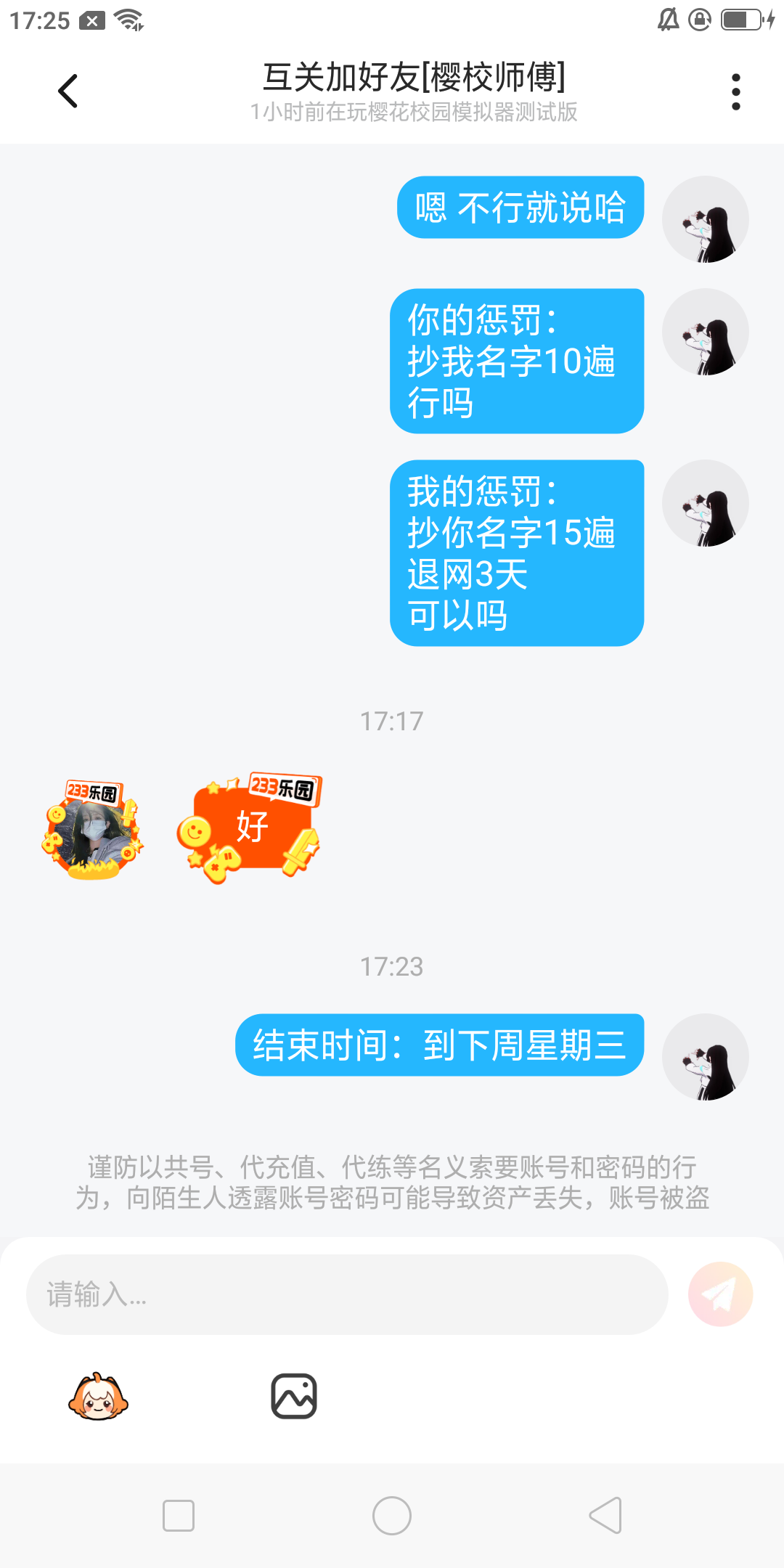 PK输了 我的惩罚是退网3天和抄对方网名15遍 这3天之内尽量不要给我发消息 等这3天过完我会发抄对方的网名的图片好了3天后见