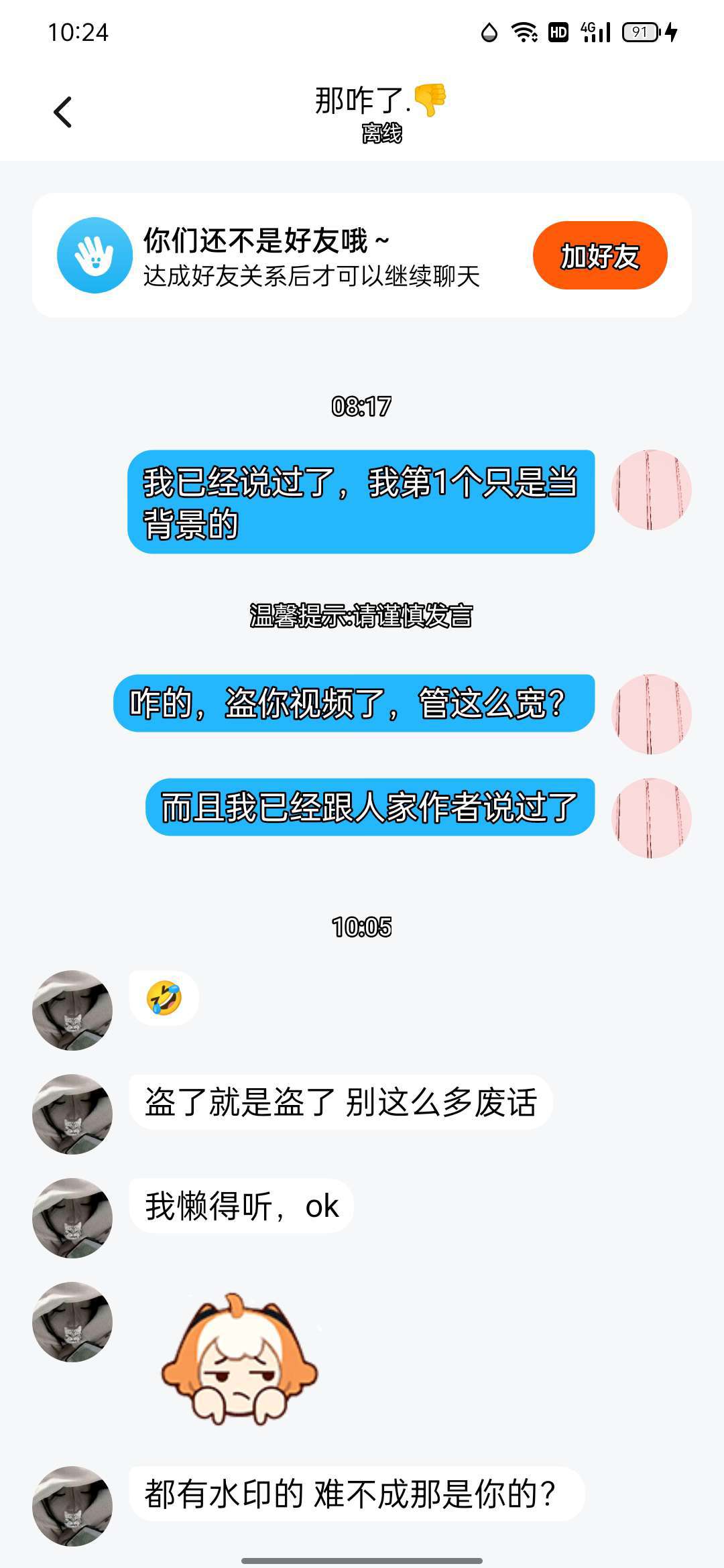 不是我盗你视频了,我都跟人家作者说过了,跟人家作者说完还不能到吗?你管的这么宽