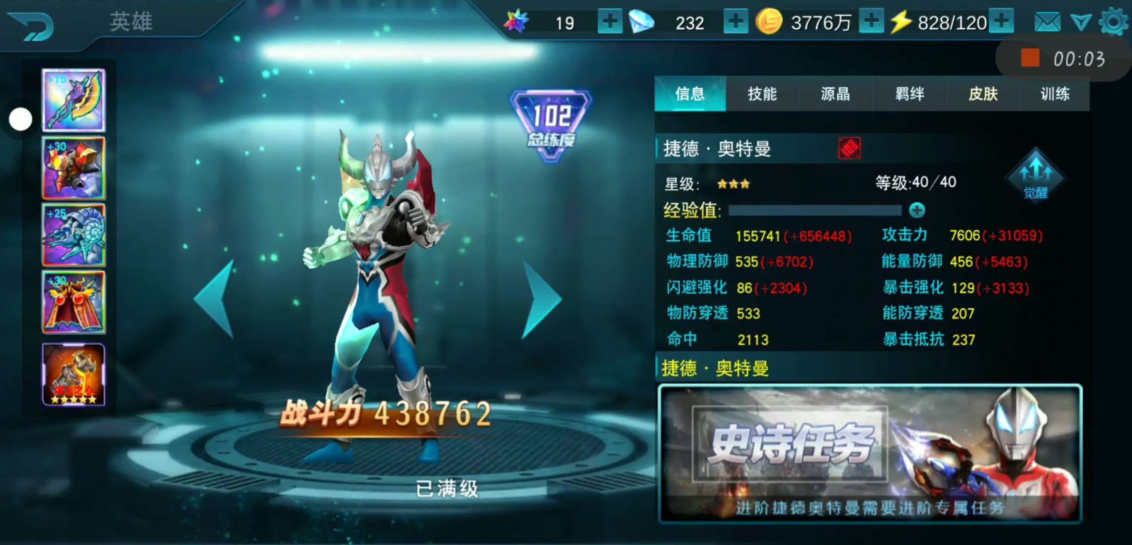 新号玩了快两个月了,泰迦单推战力107万,还可以吧😄