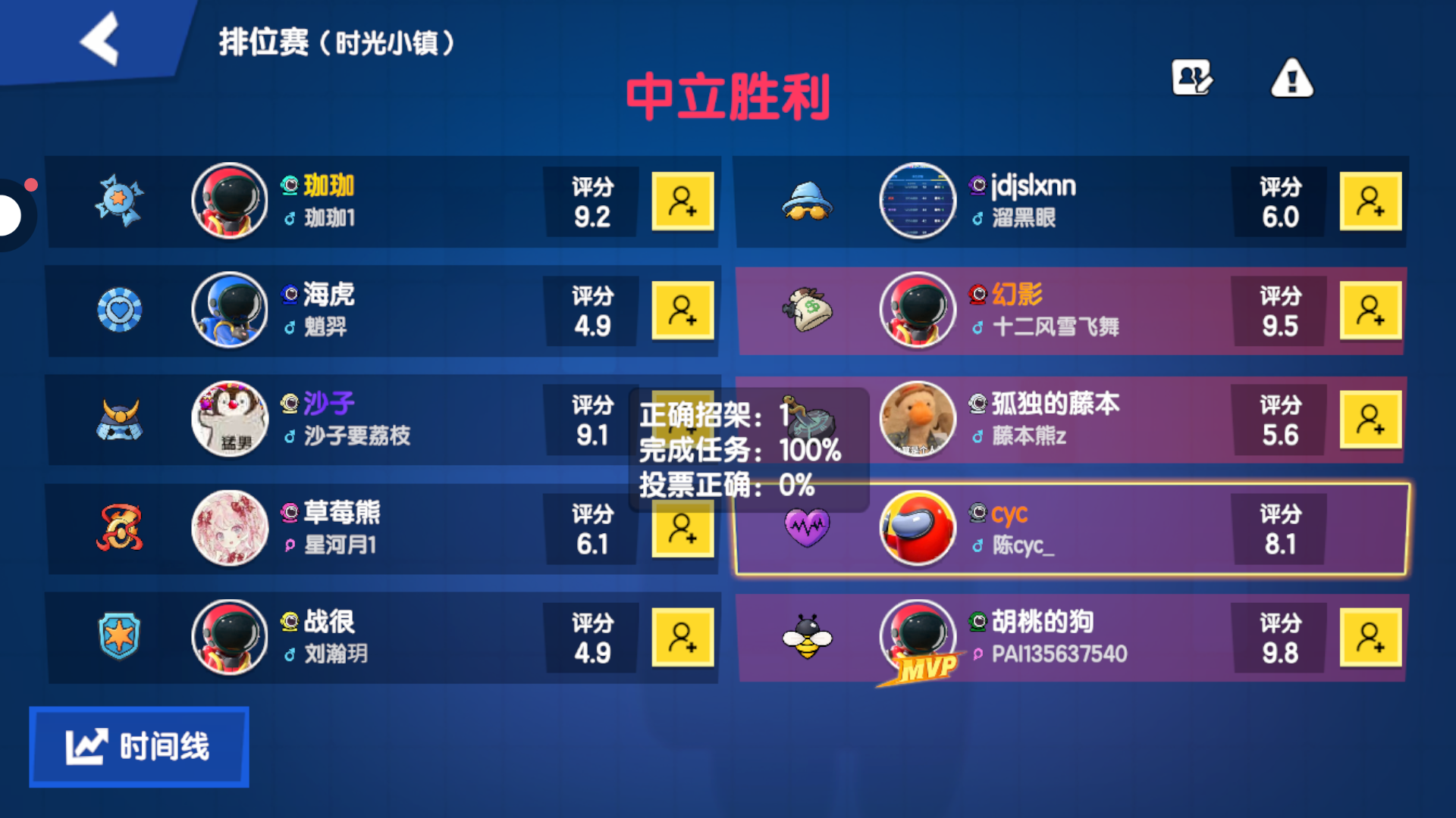 我巅峰赛打得最好的一次,所有反派的身份没有标错,投票率是百分百的