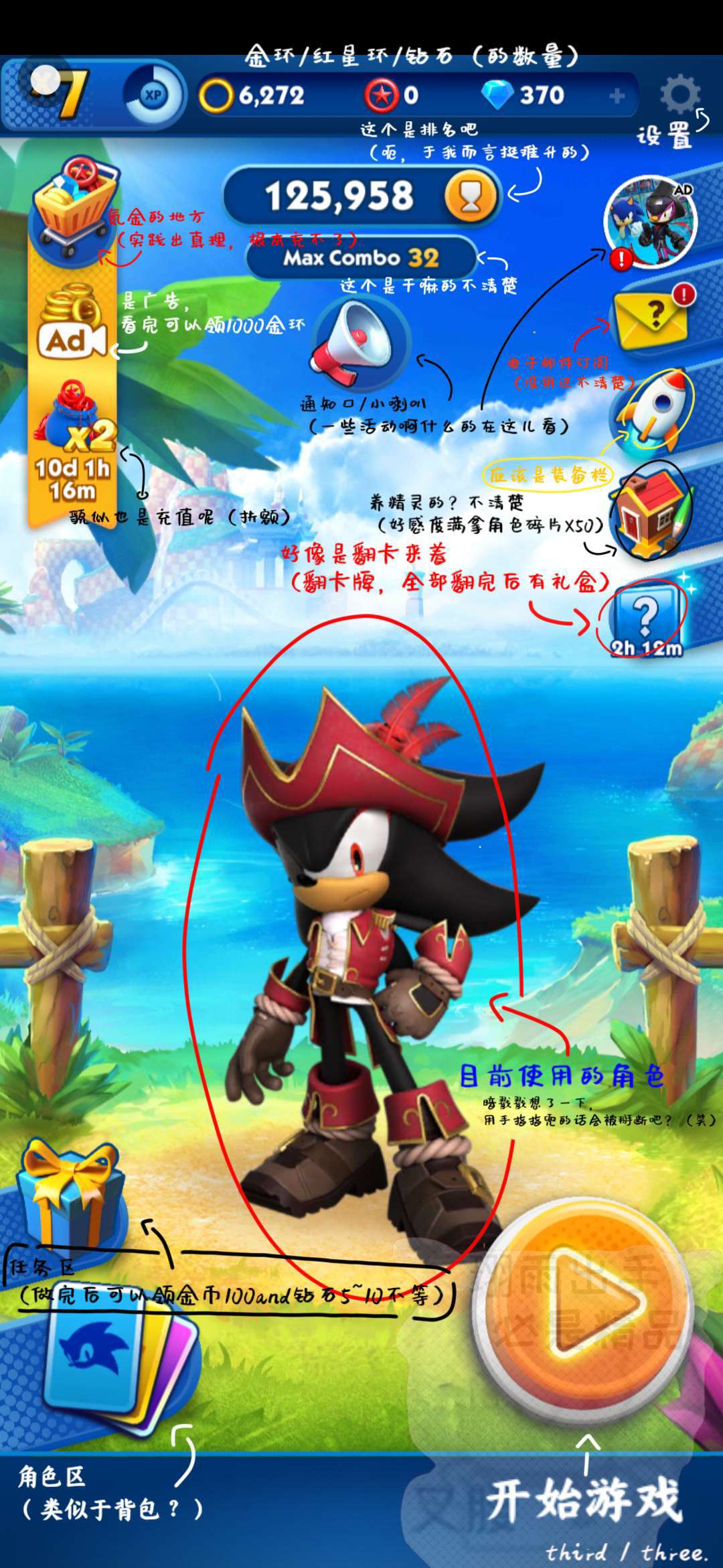 233时间计量不准,玩了七个小时但显示只有1小时的游玩时间。 —— 以下正式↓ 游玩7小时后评论: 为了傻兜和索少入的圈(锁一下🔒?) 虽然说都是英文吧,但是外语系根本不带怕的。 对比了一下玩法,和隔壁的“索尼克音爆”差不多(毕竟同一公司嘛) 个人感觉“冲刺”的整体画风、比例还有质感要比“音爆”好 不需要肝啊,上线主角团就给齐了(索尼克/艾咪/纳克鲁斯/塔尔斯 ) 然后升级也是蛮快的(这里指角色升级) 谁懂?兜是我一个广告拿到的(开心. jpg) 可是他真的好好用啊,我只能说不愧是终极生命体(笑) —— 画风:★★★★★ 奖励:★★★★☆ 体验:★★★★★ 上手:★★★★☆ 灵活:★★★★☆ 难度:★★★☆☆ 趣味:★★★☆☆ 流畅:★★★★☆ 清晰:★★★★★ 差不多就这样,再加一颗星⭐ 因为是我家圈子(笑) —— 以下是整理的基础攻略: ⒈ (见图一) ⒉ (见图二) ⒊ (见图三) 游戏内容就不多说了,毕竟人家是有指导的唉(,,・ω・,,) ⒋ 不是每个人都能靠一个广告拿到兜(得意的旋转跳跃再“啪叽”一声摔在地上) (见图四) 后面应该还会再补吧,不过先等我坚持玩个两三天再说(挠头) —— 暂时先这样,嗯 珝雨/李子 2025.3.22 23:13 星期六 发布.
