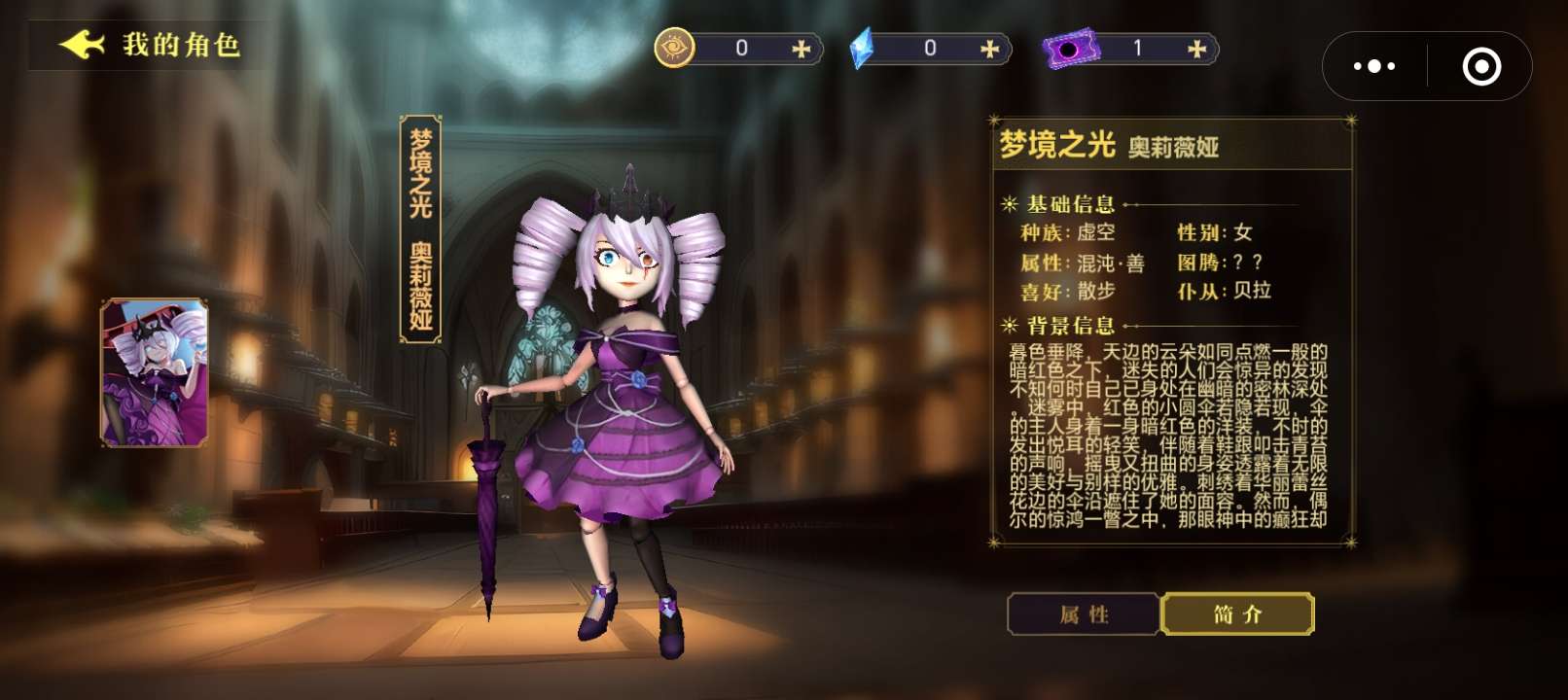 姓名:奥利维亚 属性:混沌·善 图腾:?? 喜好:散步 血型:0形 年轻:未知
