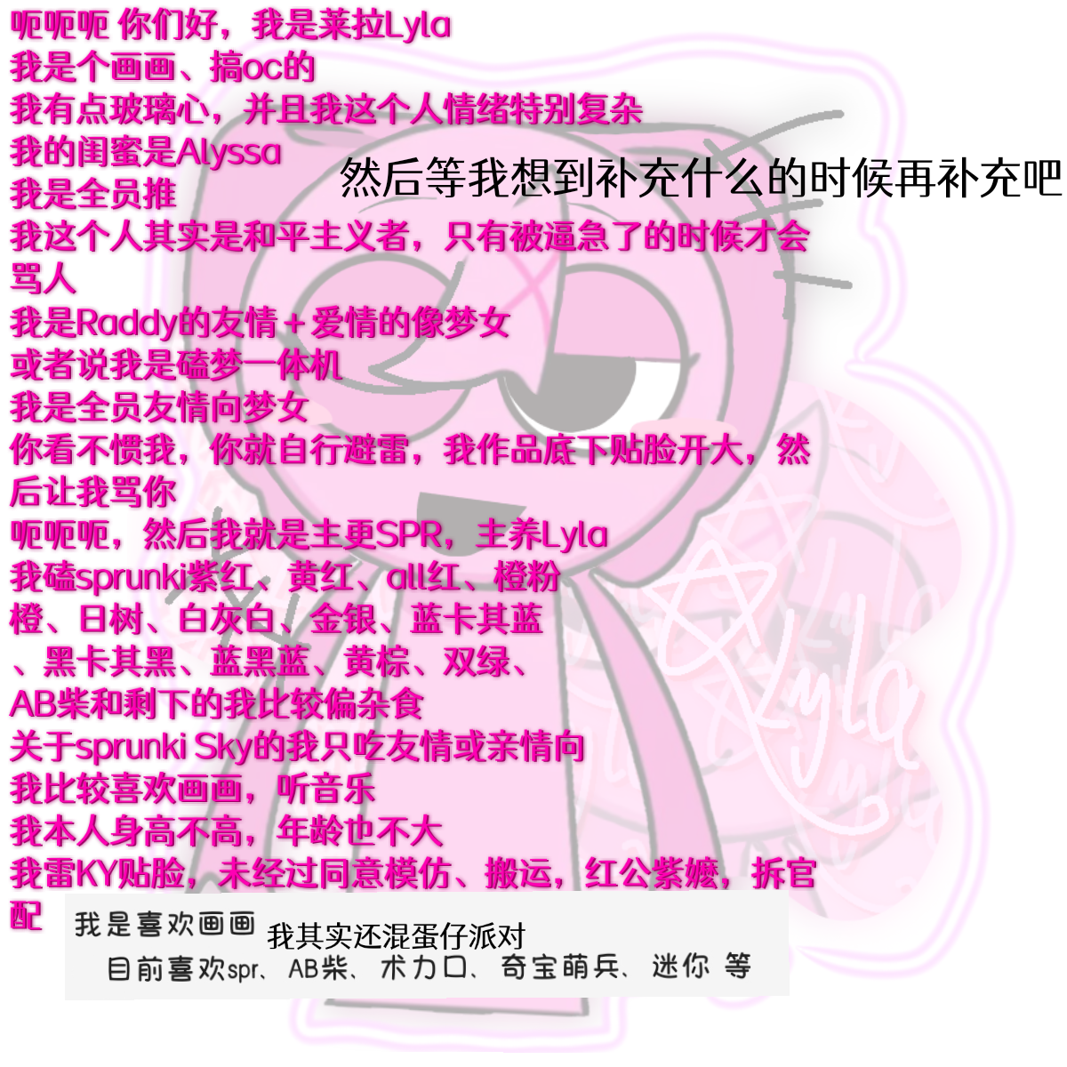 我是喜欢画画 的目前喜欢spr、AB柴、术力口、奇宝萌兵、迷你 等 主更spr 剩下的我放背景里了。