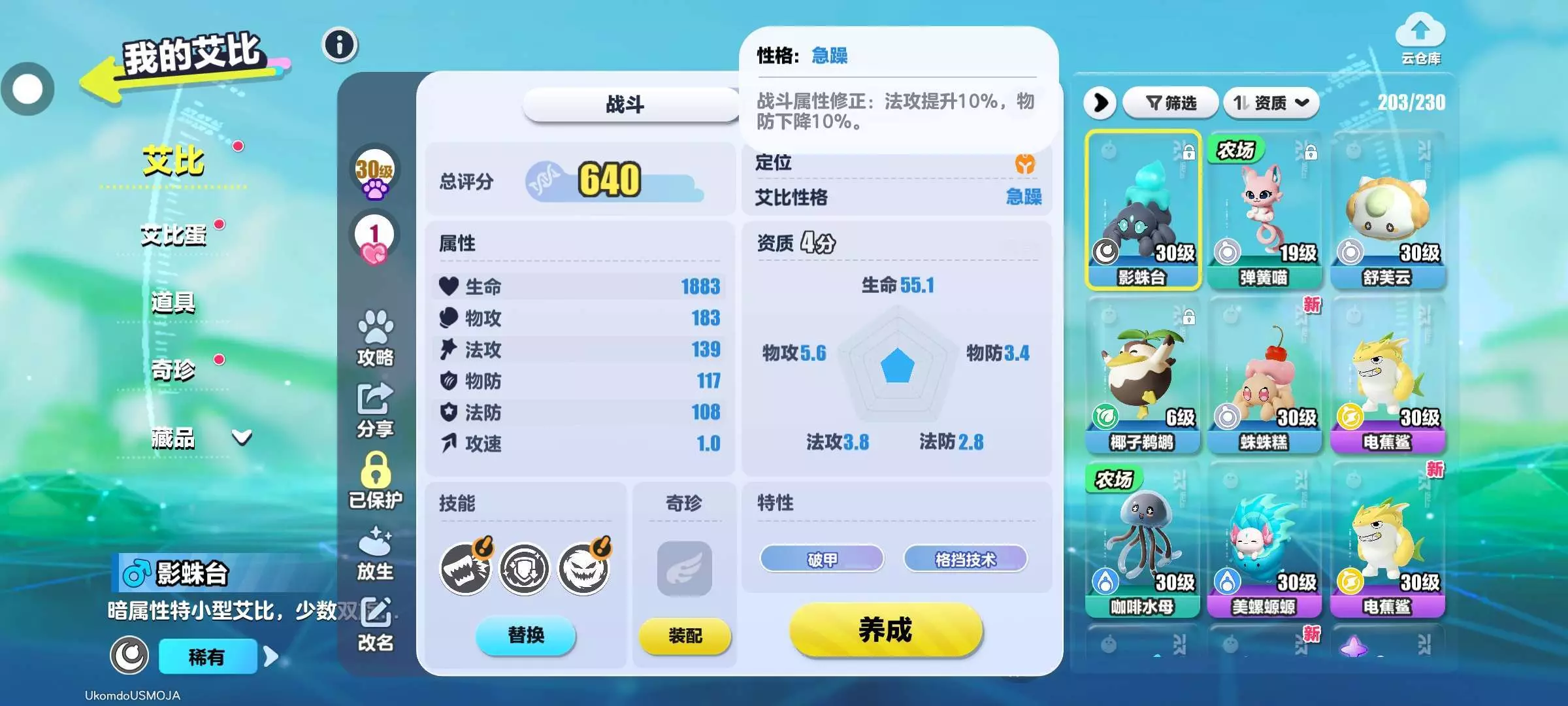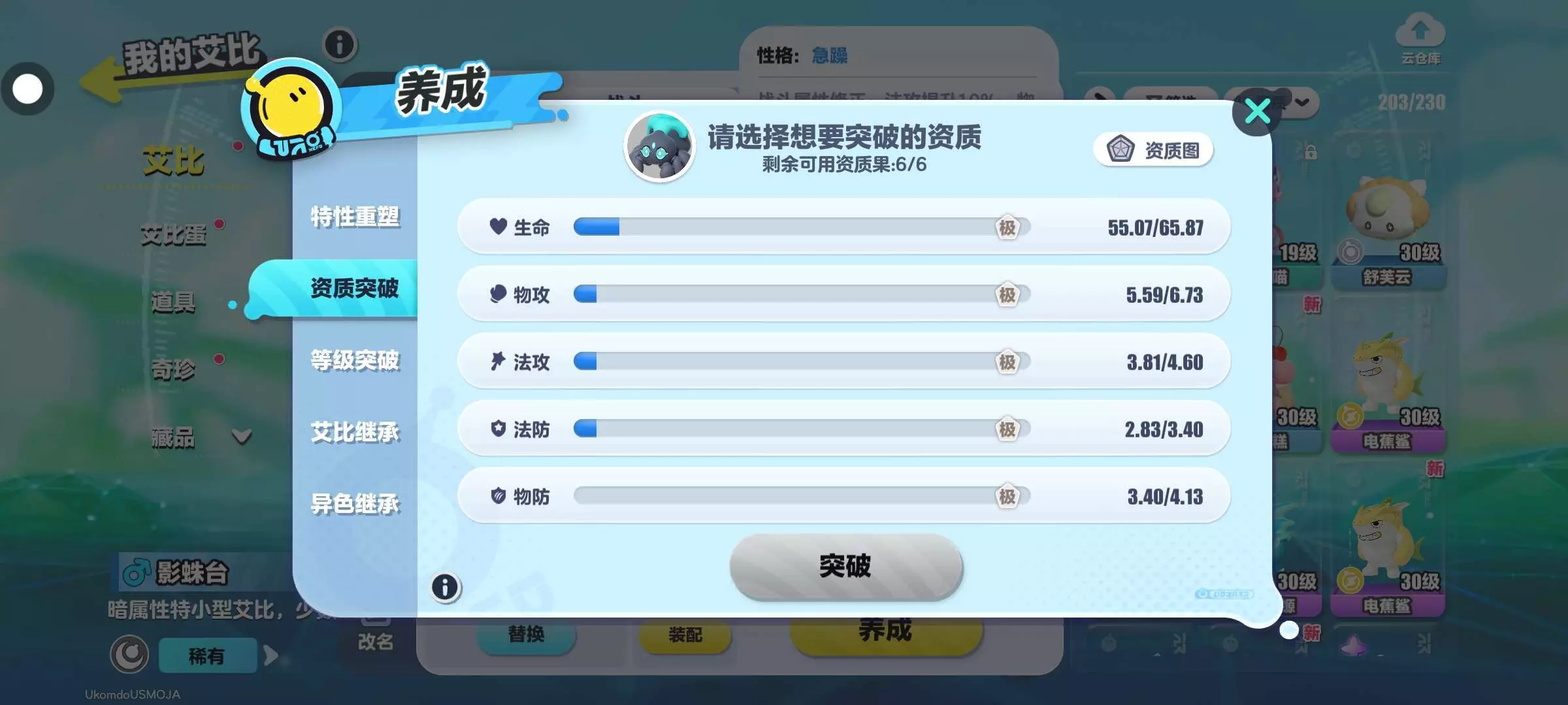 幽灵浣熊需要突破就抓了几只影蛛台,用来放生突破幽灵浣熊,结果就抓出了一只资质只有四分的,而且性格也是降物攻的。