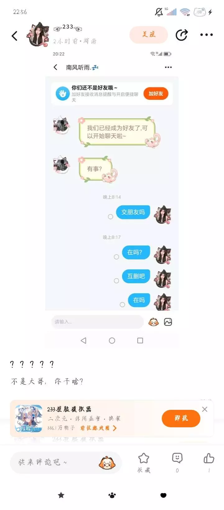 来不来就拉黑我,你拉黑我呀!呵呵🙃,我还举报你呢!招你惹你呀?我还告诉你你惹错了人!!!😡😡😡😈😈😈我的天哪?不是你啥意思?你加我,我同意。结果她上线我不在就发我消息。一天在吗在吗,我不在线谁知道你会发消息啊!还发个啥帖子,大哥大啥哥呢?我还叫你小弟呢!无语死了💢💢