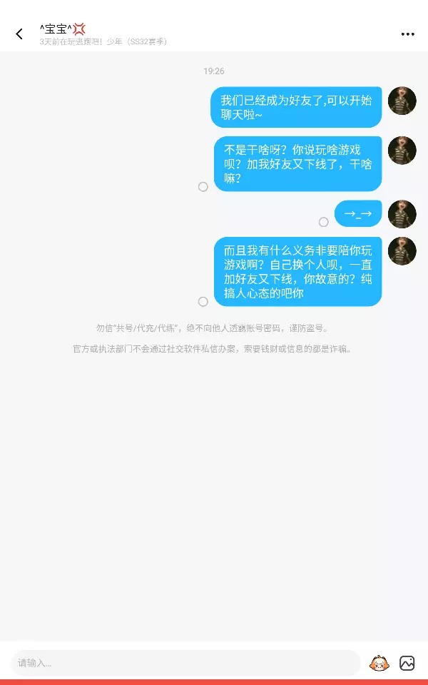 我的妈呀,这个人神来的吧,一直加我好友,让我陪他玩游戏,根本就不认识他,删了好友又加,纯搞人心态
