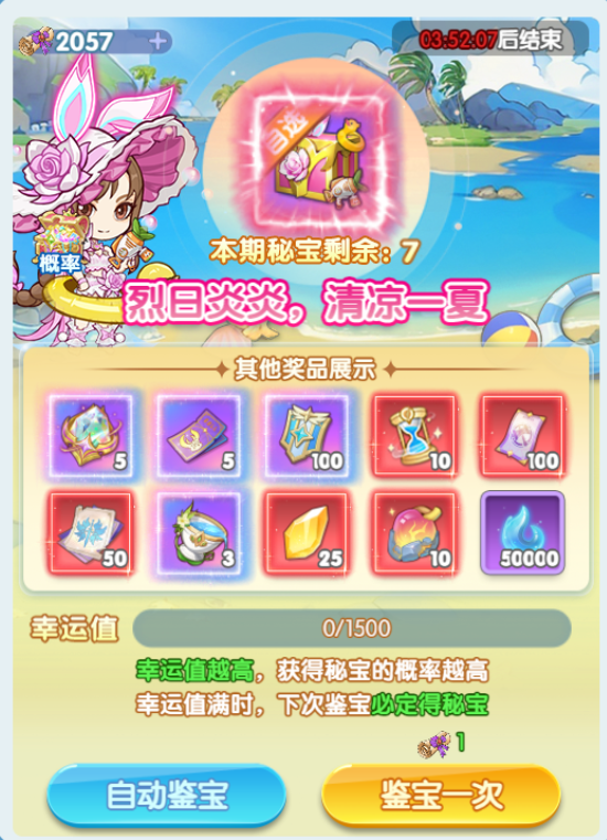 ※ 活动期间,拍卖会于每日上午10:00--晚上21:00开放,每30分钟开启1轮拍卖,使用金锤开启宝匣可概率开出夜明珠、金丝玉及碧翡翠,并获得对应档次的奖励及慧眼值。其中夜明珠极为珍稀,每轮仅有1颗,若有幸运小主开出夜明珠,则该轮拍卖提前结束并进入下一轮。累计开启宝匣次数,还可领取慧眼宝箱,其中包括慧眼值和道具奖励。