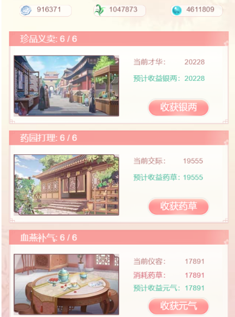 在文章的开头,我就和大家提到了药园打理和血燕补气这两个重要的项目。如果想获取大量的元气和药草,那么内务打理,就是其中最基础的方式。