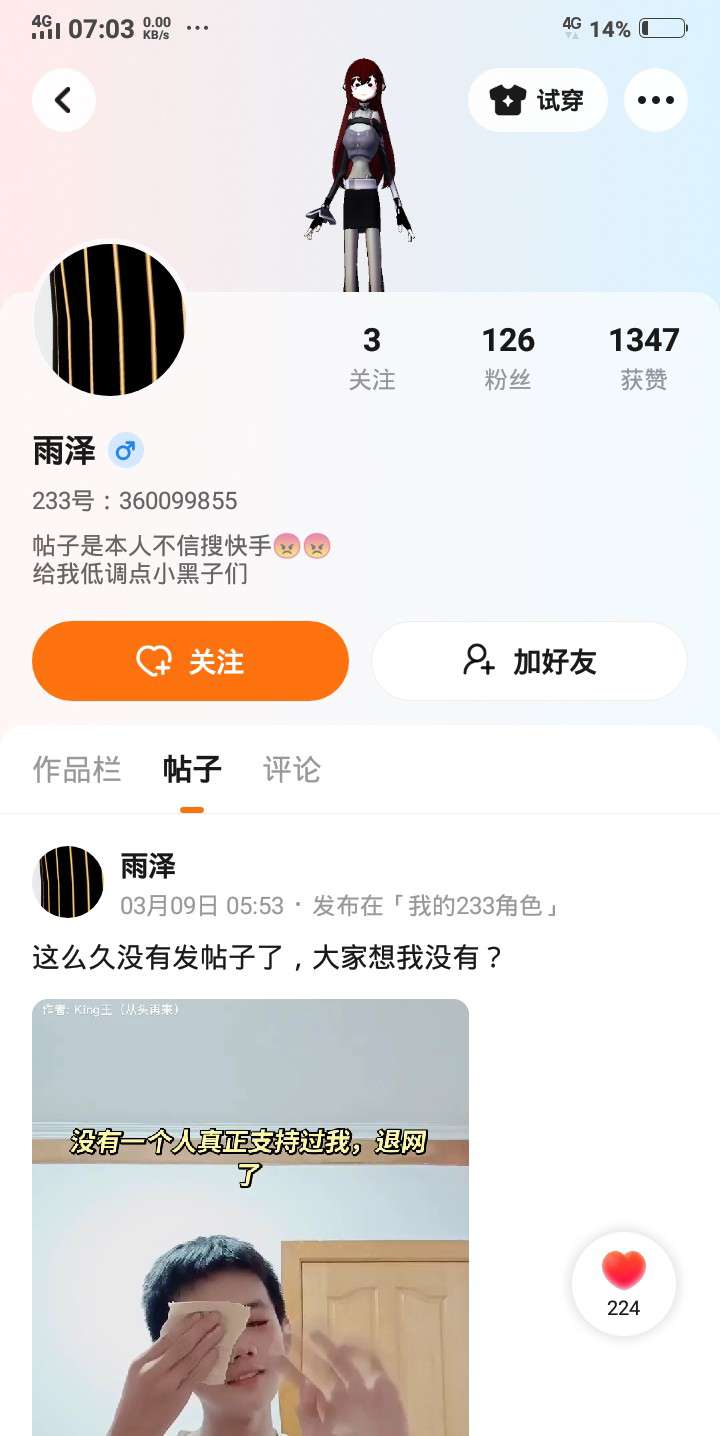 233官方。我要和你告白了。我想了很久。决定退出233乐园了。233官方你知道我为什么喜欢你吗?其实我第一天来的时候刷了一下名字。就看见了你。你那时候我决得你一定是很活泼的。可爱的。官方那个时候起。你的头像和标志都跟233很像。所以我要退了。希望你能看到