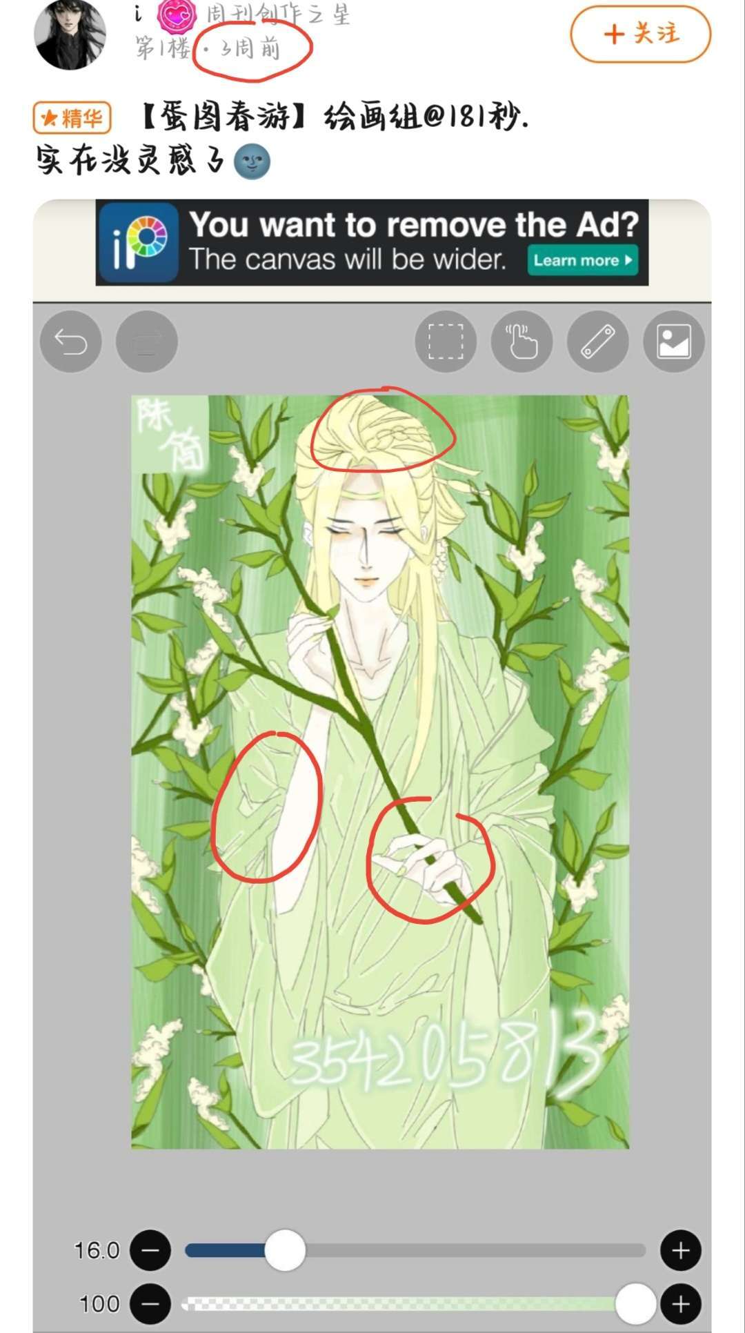 疑点2.三周前发了这样一张图,很明显就能看出这个头发和其他所有部分不是同一个人画的,因为画头发的线条细,而且头发的结构也是完全错误。如果你这个是用模板画头发的,应该在底下说明。但我觉得你可能是拿别人的线稿抠图,自己上色。