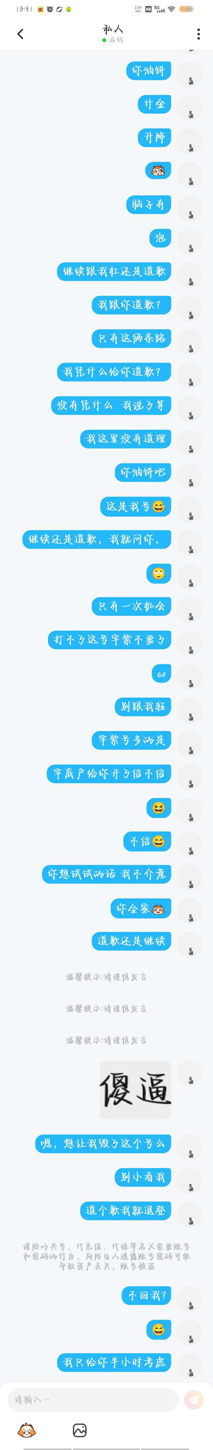 我说这位大妈你有点过分了啊,盗我号还这么理直气壮?威胁我?盗我号骂我好友?删我帖子?给我好友发消息学我说话😂你是不是心理阴暗啊😶自己号不用盗别人的?像个老鼠一样见不得光?你技术得有多菜啊几个小时给我刷三次死亡?你以为你谁啊?把我号毁了?你觉得我信?😅道歉我肯定不会道,又不是我的问题,发这个帖子就是告诉我的好友们骂你们的不是我本人😂