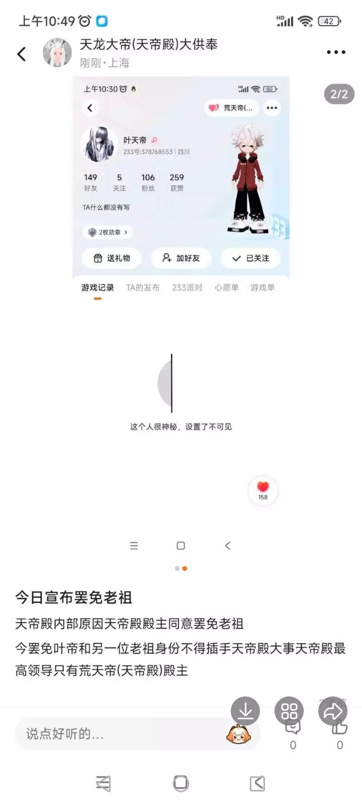 天帝殿天龙,羞辱当今老祖,还将此图片发往各处,今天又妖言惑众。上蛊惑老祖,下蒙骗百官。竟然敢撤销老祖两位老祖的权利和名字。朕,逍遥大帝,今日起兵:奉天靖难,以清君侧,立宗门之威,护天帝正统!