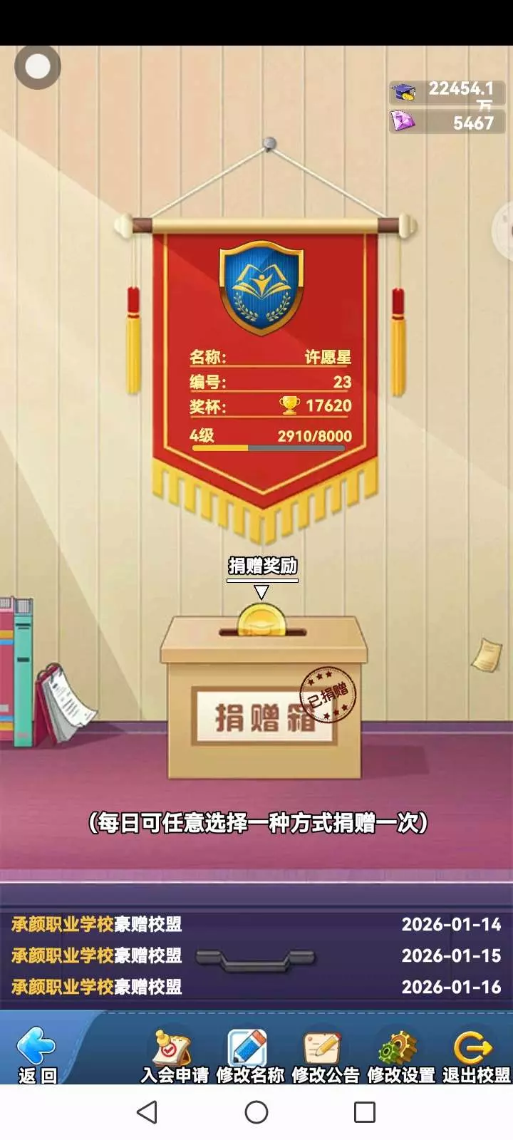 我这校盟里面啥人也没有,都是我一个人贡献到四级,嗯,好吧,就算之前有人加入过,但因为动不动就很久不上线,甚至一次都没有贡献过,当个僵尸玩家被我踢了。不知道为啥,老多人都这样,啊,来个人吧😨,普、豪赠都行,贡献就行,常上线啊。一大堆的僵尸玩家,给我来个活跃的人加入吧啊,我真求你了喂😀