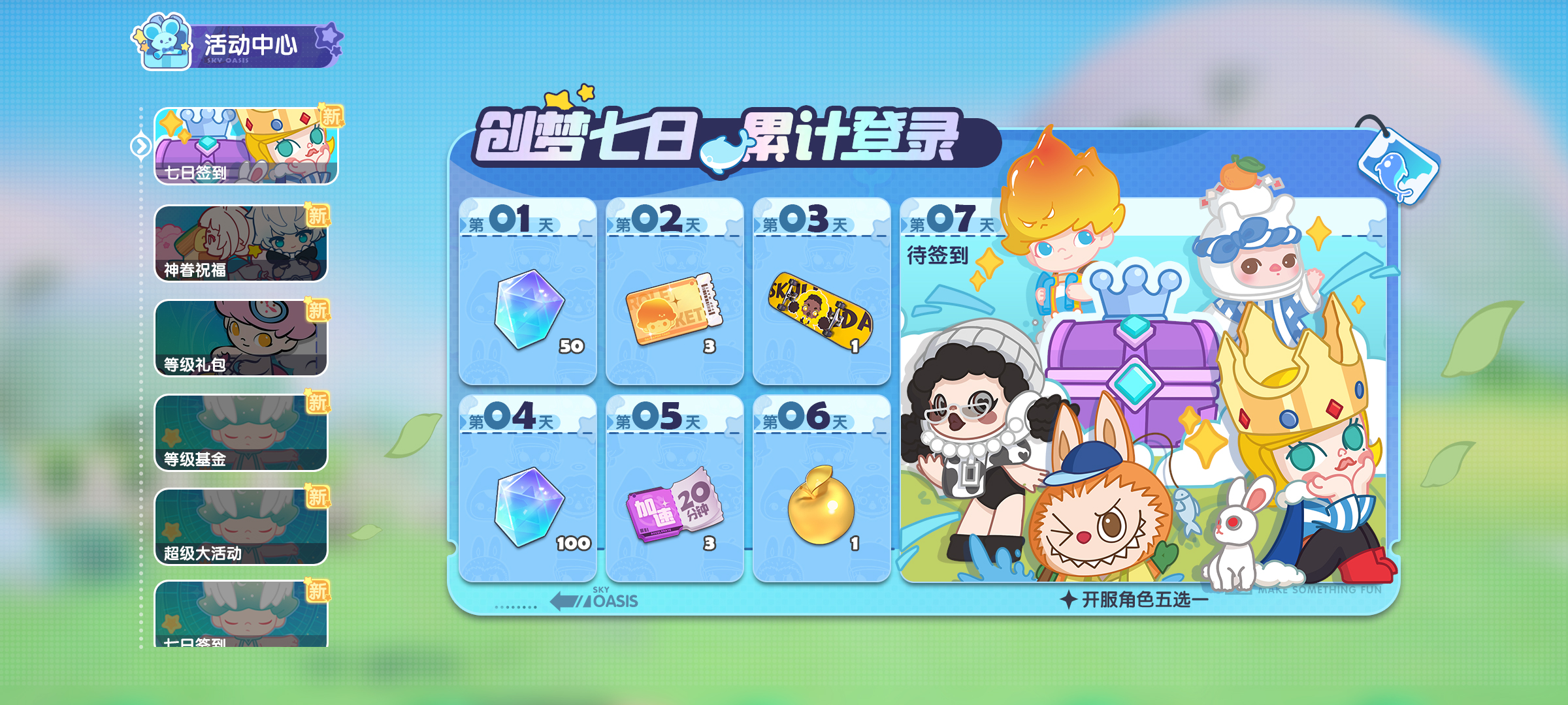 特此奉上:尼龙布*5、缝纫线*5、拉链*5,软糖*2,限定角色券*10,在7月3日前进入云鲸岛的绘梦师均可领取。