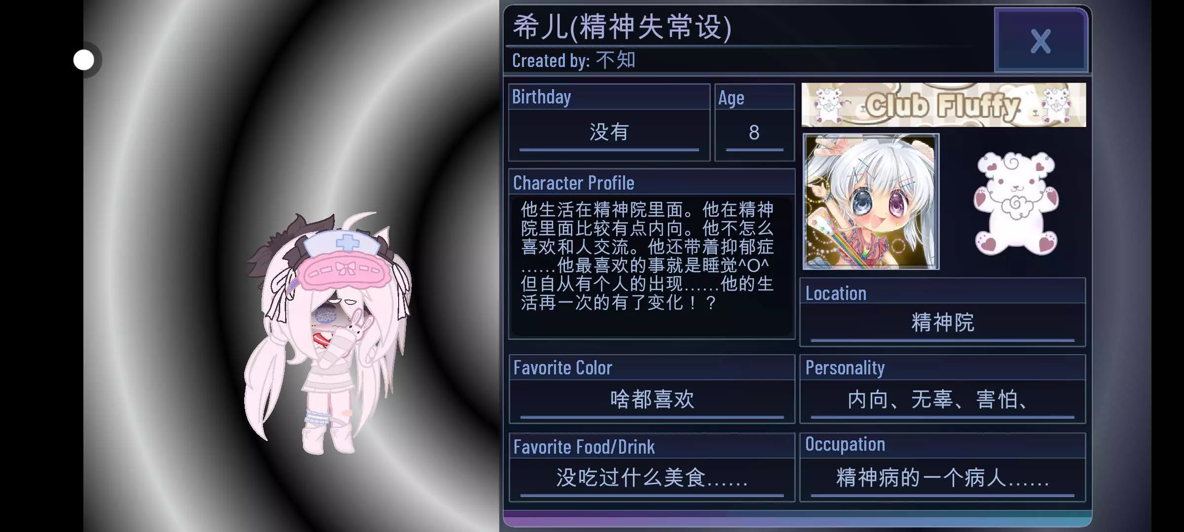 希儿(精神失常设)|没有|8|他生活在精神院里面。他在精神院里面比较有点内向。他不怎么喜欢和人交流。他还带着抑郁症……他最喜欢的事就是睡觉^O^但自从有个人的出现……他的生活再一次的有了变化!?|不知|啥都喜欢|没吃过什么美食……|精神院|内向、无辜、害怕、|精神病的一个病人……|140|18|18|13|14|13|51|0|1|0|1|1|66|111|25|7|1|71|71|30|30|86|86|23|16|0|55|0|62|100|54|38|151|123|0|46|46|22|22|125|125|0|0|95|0|0|0|0|0|0|1|0|0|0|0|5|5|249|0|1|1|0|1|2|1|15|1|6|4|1|11|1|14|14|1|1|174|1|1|1|12|10|0|6|8|5|1|0|1|1|1|1|0|0|0|0|0|4|16|1|16|-12|-4|16|1|16|12|0|0|11|11|0|0|0|11|11|0|16|29|13|12|-9|-14|29|16|12|9|-3|3|17|12|6|-2|10|12|12|0|8|10|18|20|0|0|-38|19|20|0|10|12|1|1|354|14|4|1|4|0|10|-4|1|3|3|-6|-12|1|1|0|0|-6|16|15|0|10|6|17|7|0|-4|10|1|1|0|1|19|0|19|19|357|0|0|1|1|0|1|0|7|13|1|3|18|4|1|1|1|0|0|1|1|0|0|1|1|0|1|1|1|1|1|1|1|1|1|1|1|1|1|1|1|1|2|15|0|0|1|1|0|1|0|-8|0|19|3|-6|0|1|1|0|0|0|-4|0|0|0|0|0|0|1|1|1|0|0|28|-36|0|0|0|0|0|0|FFFFFF|DBB2C6|FFFFFF|D4D4D4|FFFFFF|FFFFFF|D4D4D4|FFFFFF|FFFFFF|D4D4D4|FFFFFF|D4D4D4|989898|D4D4D4|FFFFFF|D4D4D4|FFFFFF|FFFFFF|FFFFFF|8AAEFF|8AAEFF|8AAEFF|989898|989898|989898|FFFFFF|FFFFFF|FFFFFF|FFFFFF|FFFFFF|191919|FFFFFF|191919|FFFFFF|FFFFFF|FFFFFF|FFFFFF|FFFFFF|FFFFFF|FFF0E7|020202|FF93BC|FF0000|FF0000|FF0000|FF8383|8589FF|FFDEDE|FFC2C2|FFDBEF|CB8DA8|FFFFFF|E0F4FF|8AAEFF|BDE3FF|FFBBDC|CB8DA8|FFDBEF|333333|020202|FFFFFF|FFFFFF|DBB2C6|FFFFFF|333333|020202|191919|ECECEC|D4D4D4|FFFFFF|01B9E5|0093B6|FFFFFF|FFFFFF|B8B8B8|FFFFFF|FFFFFF|B8B8B8|FFFFFF|FFFFFF|D4D4D4|ECECEC|FFFFFF|D4D4D4|ECECEC|FFFFFF|D4D4D4|FFFFFF|FFFFFF|D4D4D4|FFFFFF|FFFFFF|D4D4D4|FFFFFF|FFBBDC|CB8DA8|FFFFFF|FFFFFF|0093B6|01B9E5|FFFFFF|0093B6|01B9E5|FFFFFF|D4D4D4|FFFFFF|FFFFFF|D4D4D4|FFFFFF|FFFFFF|D4D4D4|FFFFFF|FFFFFF|D4D4D4|FFFFFF|E0F4FF|ABCBDE|E0F4FF|FF3F3F|9F0000|FFFFFF|FFFFFF|6D72AA|FFFFFF|FFFFFF|020202|A487FF|FFFFFF|020202|A487FF|FFFFFF|D4D4D4|FFFFFF|FFFFFF|CB8DA8|FFBBDC|BF0000|020202|FFFFFF|FF3F3F|020202|191919|3FC4FF|0093B6|3FC4FF|3FC4FF|0093B6|3FC4FF|FFFFFF|ABCBDE|E0F4FF|FFE2D4|FFE2D4|FFE2D4|020202|FFBBDC|020202|FFFFFF|020202|FFFFFF|020202|020202|020202|D4D4D4|020202|020202