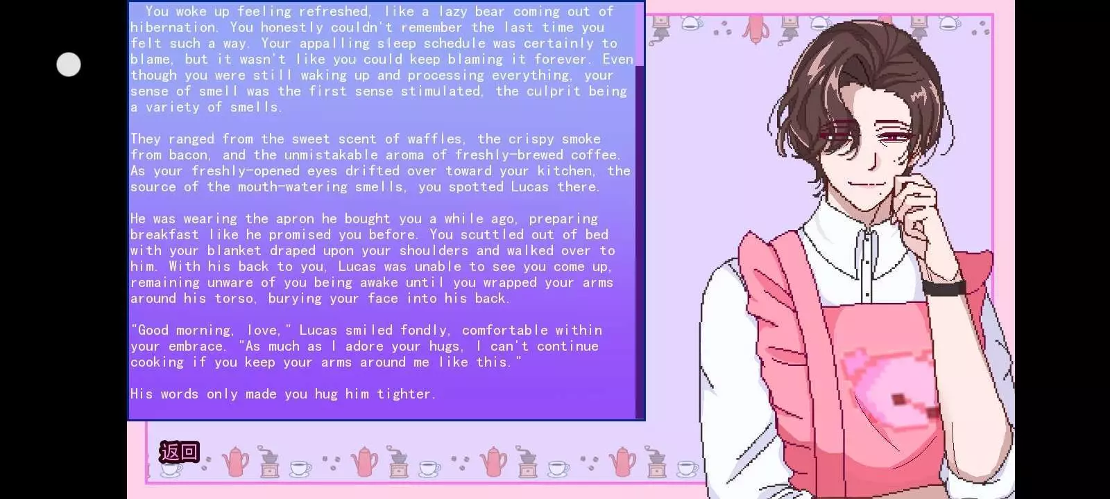 有华夫饼的香甜味、培根的焦香,还有刚煮好的咖啡那辨识度极高的香气。你刚睁开眼,目光就飘向厨房——那些诱人香气的源头,你看到卢卡斯(Lucas)在那儿。