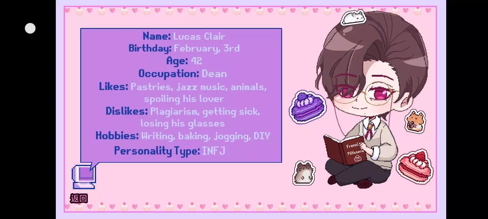 - 喜好:糕点(Pastries )、爵士乐(jazz music )、动物、宠爱人(spoiling his lover )