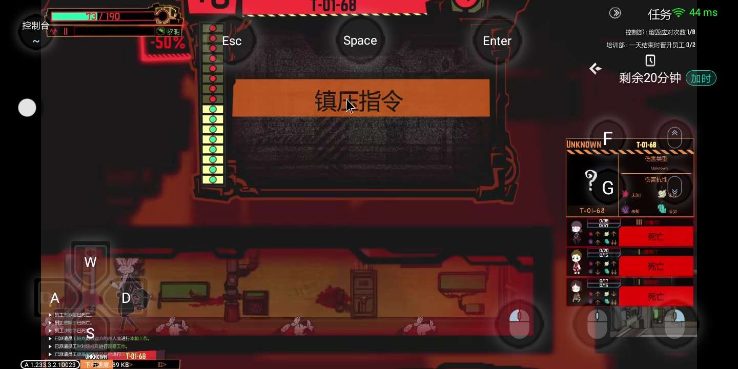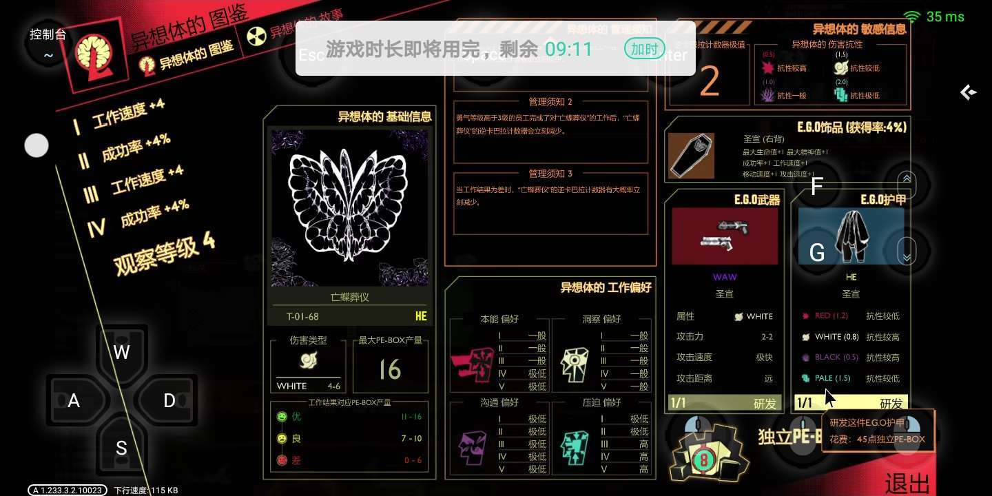 第十五天紫萝兰的正午干了我那蝶哥装的员工,第十六天开安保部,安保部的员工只剩下一位,还恐慌,小鸟帮他加理智,他把小鸟干了,能出来的异想体全出来了(美味的食物也在),我就看戏,因为镇压不过来,后面重开这一天