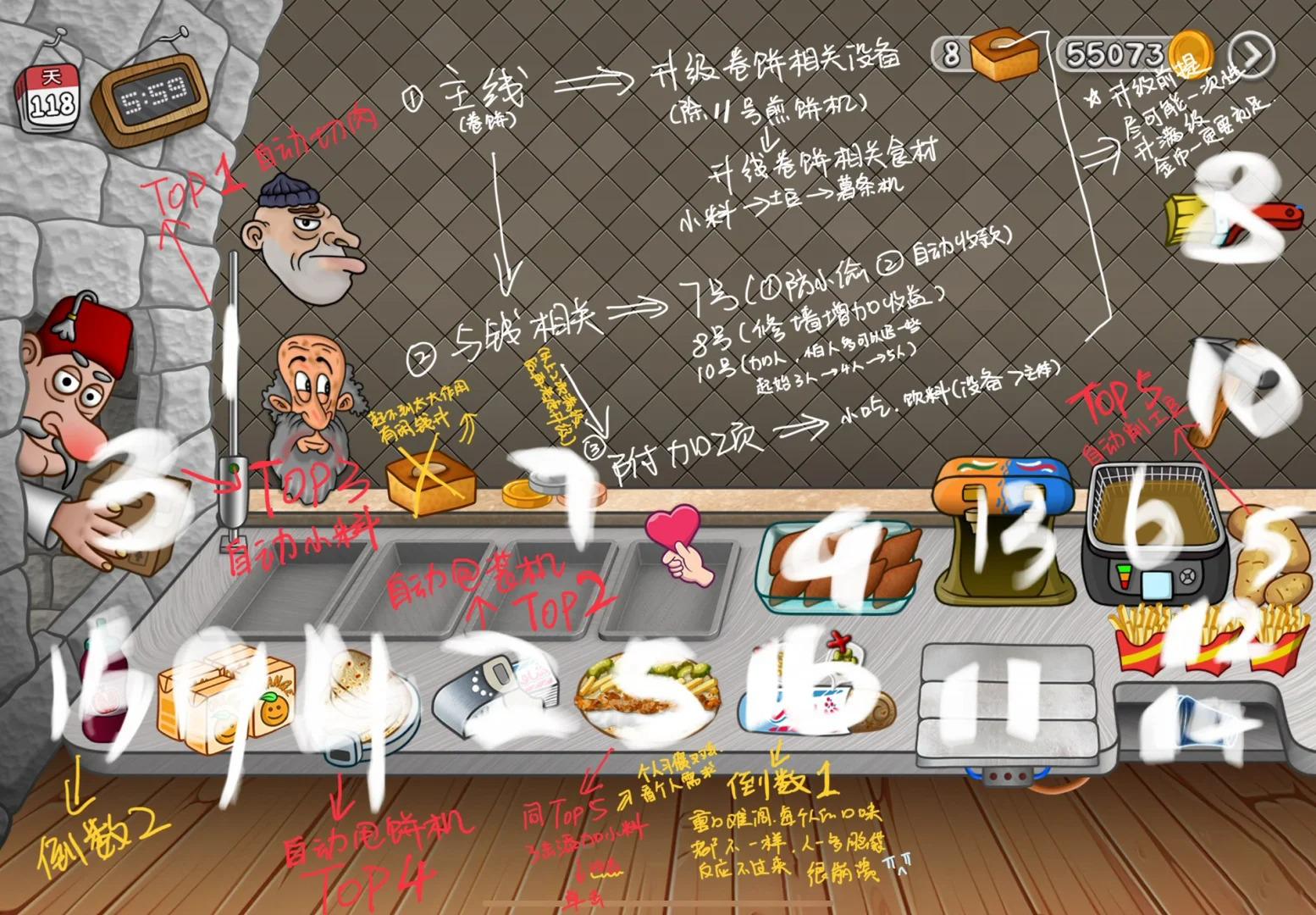 3.除设备店员以外的东西尽量越迟升越好(卷饼口味升级这个一定一定要放到最后超级好麻烦且很容易点错很锻炼大脑)