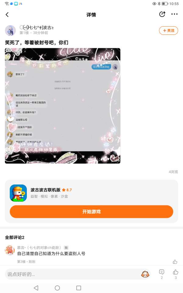 妹子也是无敌了哈,你自己被缘无故封的不关我事,反正我又没举报你,老妹用着低质量的词语,还不敢亮出自己是几年级的那小孩也没惹谁,只不过是以为罢了,你词语都用的几年前的了,怀疑你是2g网,我的妈呀,你们233都这样吗?笑了,跟我道歉,我或许还可以原谅你呢?