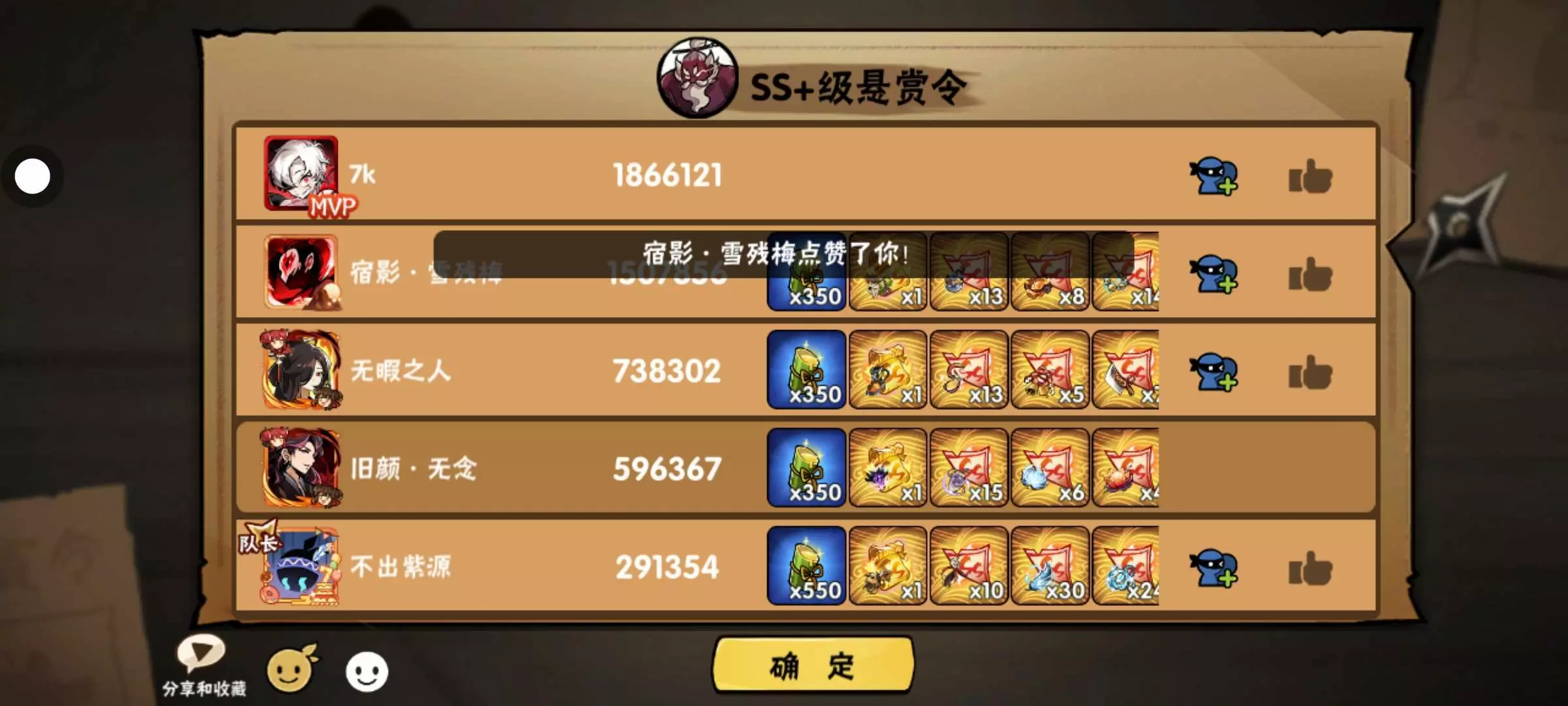 刚过两个boss就剩3人,我和另外两个大佬打了1700万,我只打了400万,有了三勾忍宗上限真的很高