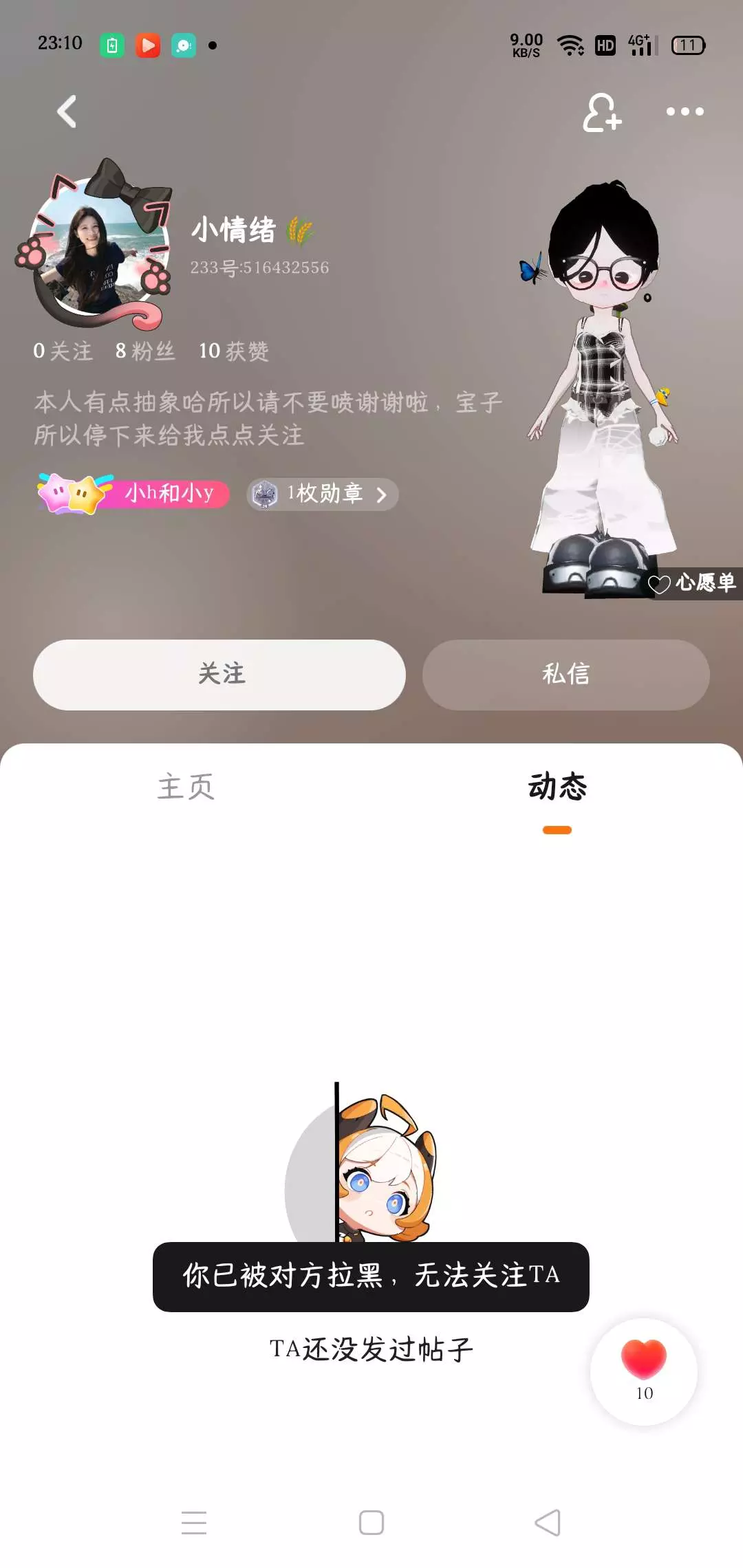 那个好友呢,他叫小情绪,然后之前和她断了关系。然后呢,我就最近看一下她主页,没想到和我的服装一模一样,丸子头他那里是有的免费的。而且上衣裤子也一样,他把我删了,还想报复我。所以就盗了我服装,你们说这是不是?