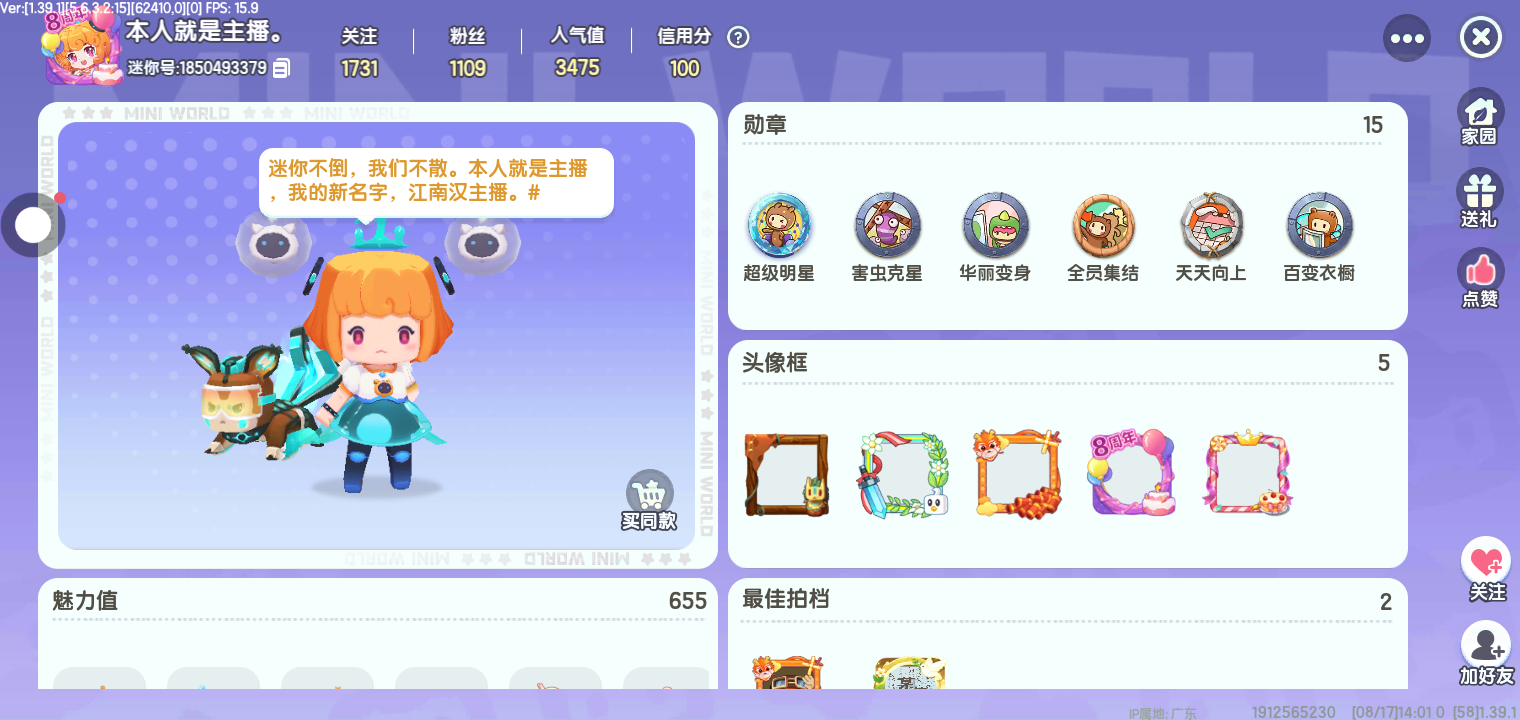 迷你世界江南汉主播,我,[R ]竹,知己。E以前的账号不用了