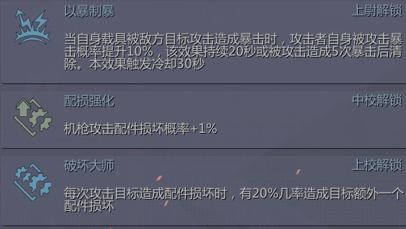 配损强化和破坏大师主要针对配件损坏,既加了百分之一的配件损坏概率而且打出配损后有五分之一的几率再造成一个配件损坏,这个就非常恶心,和布雷德利的燃烧发动机起火概率有类似之处,如果一下打坏两个武器就让敌人非常恶心。