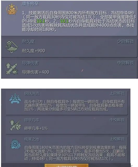 然后是朱可夫,技能是冻结自身800m 范围内的目标持续4秒 ,降低800m范围内敌军载具装甲强度30% ,持续10秒。攻击被冻结的载具 5次将解除其冻结 状态,并额外造成4000点伤害 。升到满级后 ,冻结范围变成1km,一千米内敌军载具 装甲强度会降低40%, 而且全场战斗内只要攻击被冻结的目标三次就会额外造成4500点伤害。其他属性:耐久度以及导弹伤害, 适合M1A2 之类双导弹的坦克。然后是钢铁洪流,自己一方每增加一辆坦克伤害增加2%, 每增加一辆装甲车暴击概率增加1% 。最多能增加10%的伤害以及5%的暴击概率 。还加了碎甲概率以及碎甲效果。自身范围内1800m的目标 ,每隔2秒最大速度会减少2% ,加速功率减少10% ,最多能叠加5层。如果目标耐久降到30%以下 ,将触发冻结效果。