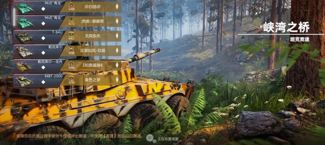 然后就是关于开局的操作,建议把自动瞄准关了,因为我们不打人主打道具箱子,尽量冲线拿奖励。一般关于竞速匹配时间比较短大概在1-20秒左右就能开,所以千万不要离开去上厕所,要不然回来就老六了,开始到加载页面时就可以看到你的几个对手用的什么车,还有对手的等级,顺便还可以看看有没有熟人。