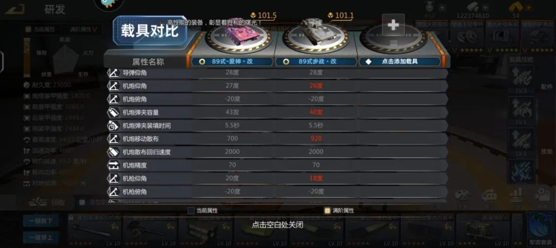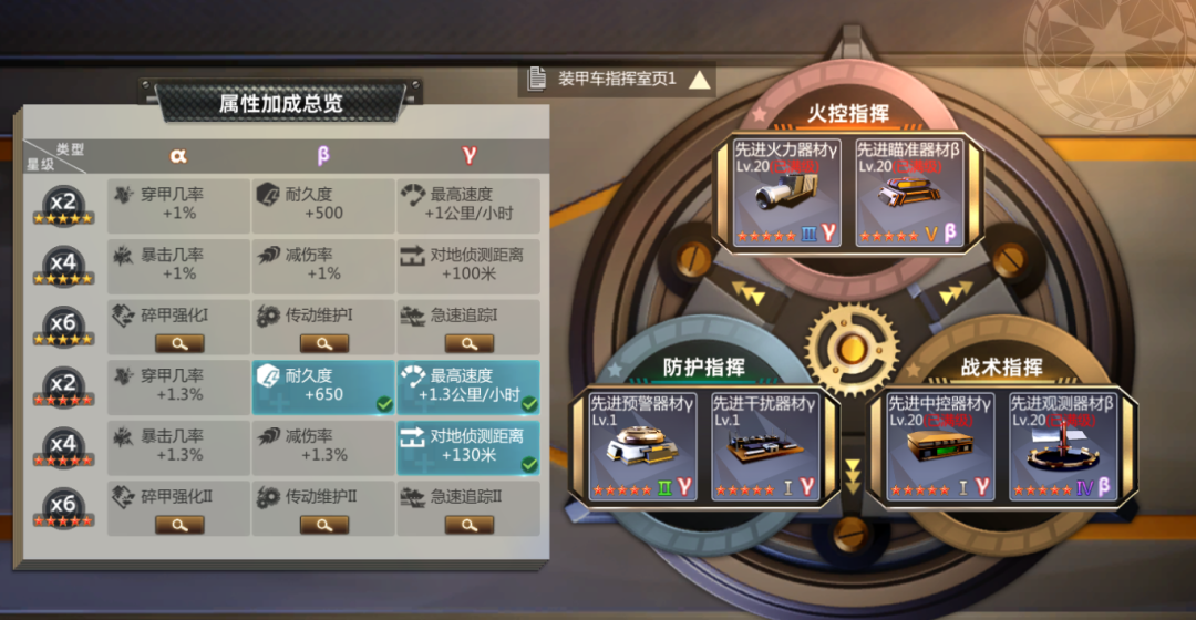 首先是指挥室,主要来看一下装甲车的,首先器材必须要红五星的,五星的器材属性比红五星差很多,而且左边的属性加成总览里的属性也只能点亮上半部分的,红五星器材的获取除了直接用金条够买外,还可以在战地宝藏里用勋章购买箱子,但是箱子开出来的器材是随机的,有可能不符合你的需要,要注意的是每个位置所需的器材类型都是不同的,而且同种器材分别对应α,β,γ三个型号,分别对应不同的属性。