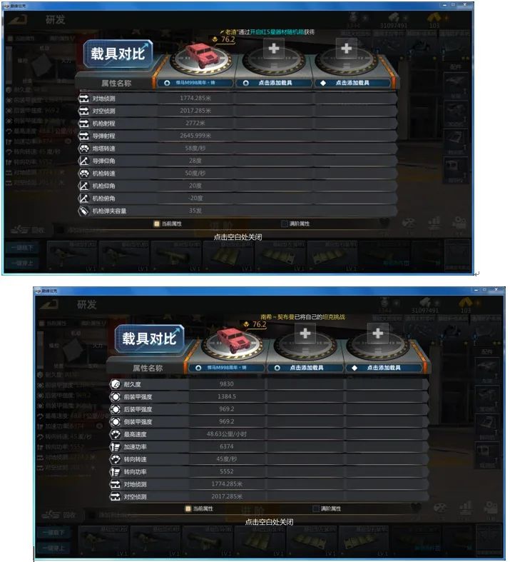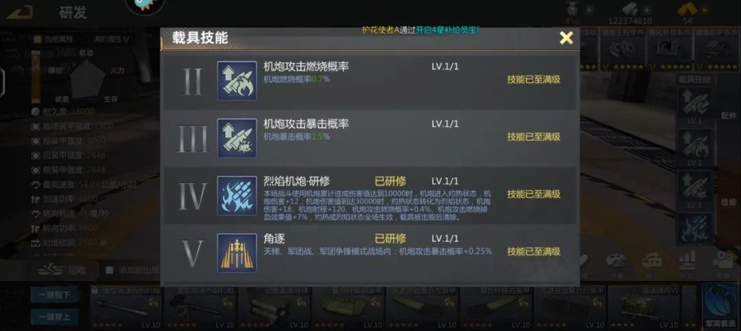 然后就是左边的属性加成总览,就是你的器材达到对应的星数获得的额外属性,机炮车建议选择穿甲几率,暴击几率以及碎甲强化,眼车建议选择速度,对地侦测以及急速追踪。
