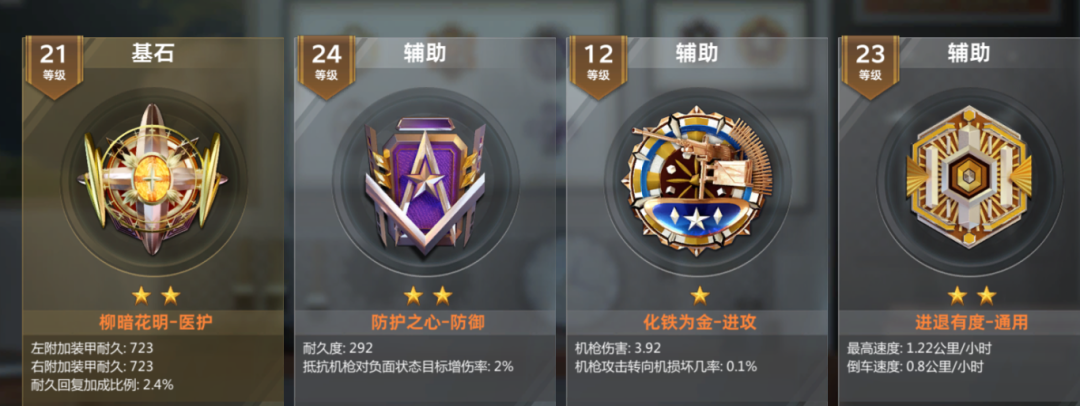 还加了侧装甲强度以及转向角速度。以自身为圆心1000米之内的敌军移动速度减百分之五,敌人载具血量,每减少百分之一,受到伤害就增加百分之0.2。