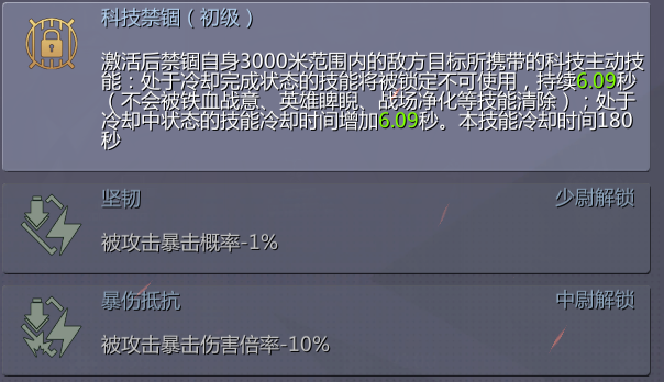 主动技能就是禁锢敌人的主动技能,并且不能被清除,如果技能没有冷却好就会增加冷却时间,有时候这对于敌人可能是致命的(坦克残血了维修开不了,装甲车没法开加速跑路,容易被集火致死)这个主要用来骚扰敌人以及趁机吃掉残血的敌人。
