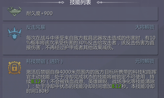 的百分之30反击给攻击者,伤害为真伤。曼施坦因升满级以后可以禁锢敌军的指挥官技能和科技主动技能,就相当于你下方的一排技能都用不了,对于有凯塞林的指挥官也是个噩梦,眼看着自己残血却开不了凯塞林的回血。