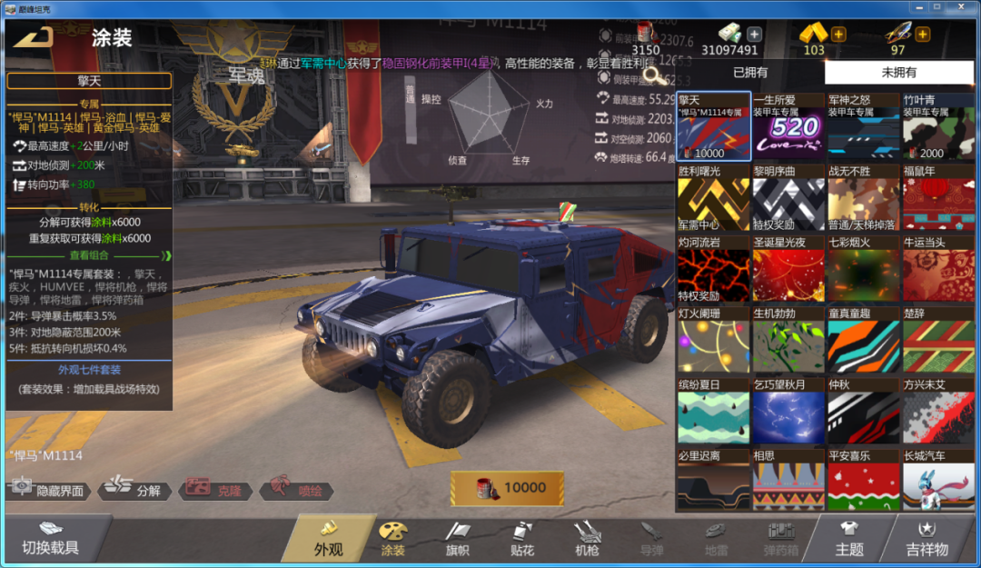 其次,我们来介绍悍马M1114,这款载具是退役军需中的一员,可以看作是简配版的悍马M1116,在刚刚过去的中秋节活动中只需要750黄金就可以获得(为啥我玩那会没这优惠),并且在平常的活动中也有机会白嫖,可以说是十分划算。它的速度在同类载具中可以算作佼佼者,但是缺点就是整体耐久度不高,不如刚退下来的卫士110,但是在探测上还是说得过去的。武器配置沿用了传统布局,拥有一机枪,一导弹和三发地雷,子弹数量50发,比其他眼车要低。而改造技能则是加强地雷伤害,增加子弹配损概率和穿甲概率,被动技能是加伤害和机枪燃烧概率,总体来说比上边的悍马M998周年要强。