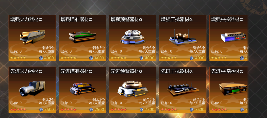 所以我这里的建议是在指挥室里的指挥商店中够买,这样就能买到你想要的器材种类以及型号,材价格是7500精密组件,精密组件可以通过分解不用的器材以及军武商店等途径获得,1精密组件的售价是1军武币,每天打三把战役模式可以获得900到1200军武币,一个红五星器材大概7天就能获得。每个器材的属性都是设定好的,所以买到器材后要先看看其属性是否需要再进行升阶,升阶可以解锁新的属性,每个属性的等级也是随机的,这个只能看个人运气。个人认为一个器材只要有一个不错的属性就可以留下。