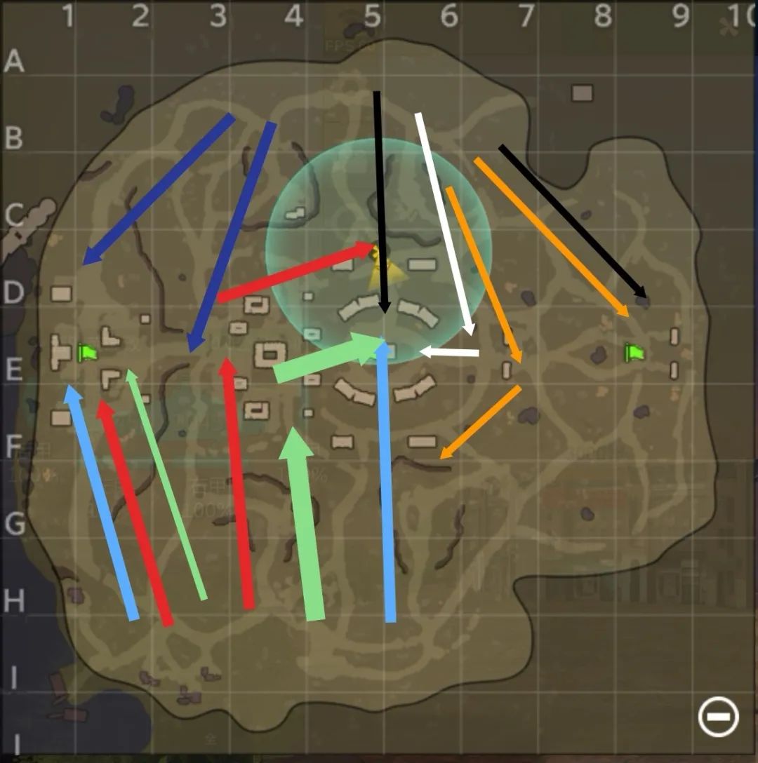 当两边是以绿色和白色箭头所示的方式来抢夺2号点的主权时,那南边的队伍自动变成了守方,北边的队伍自动成了攻方,2号点离南边队伍的距离会更近。在这种情况下离队伍较远的坦克就需要你们灵活变通了,开局就沿着地图的底线走,走到安全距离后再和大部队汇合,这样才能至少保证自己不会是零伤害。机炮作为输出点,在高地上输出尤为重要,除了飞机,坦克在看不见你的情况下除了挨你的揍,他没办法单独来追你,不但会落单,还要爬上高坡。这样的情况下我会选择避开这个输出点,当机炮没有输出后自然会选择换位置。对于蓝色和黑色的箭头打法双方都感觉坦克较硬,直接展开对决,这种情况就需要眼车去绕后干扰对面的飞机和机炮,正面眼车肯定是不能硬刚的。为什么南边的队伍不建议走23之间的平原地带呢?都说了是平原,不像12之间的有房屋错落,平原坦克或者眼车只要被点亮就会被抓单,而且这种打法在没有商量过的情况下离1近的队员是无法很快速能够做到支援,损失肯定惨重。总的来说,这张地图很需要玩家之间的配合,关注队友的出生点从而采取应对措施是非常有必要的。