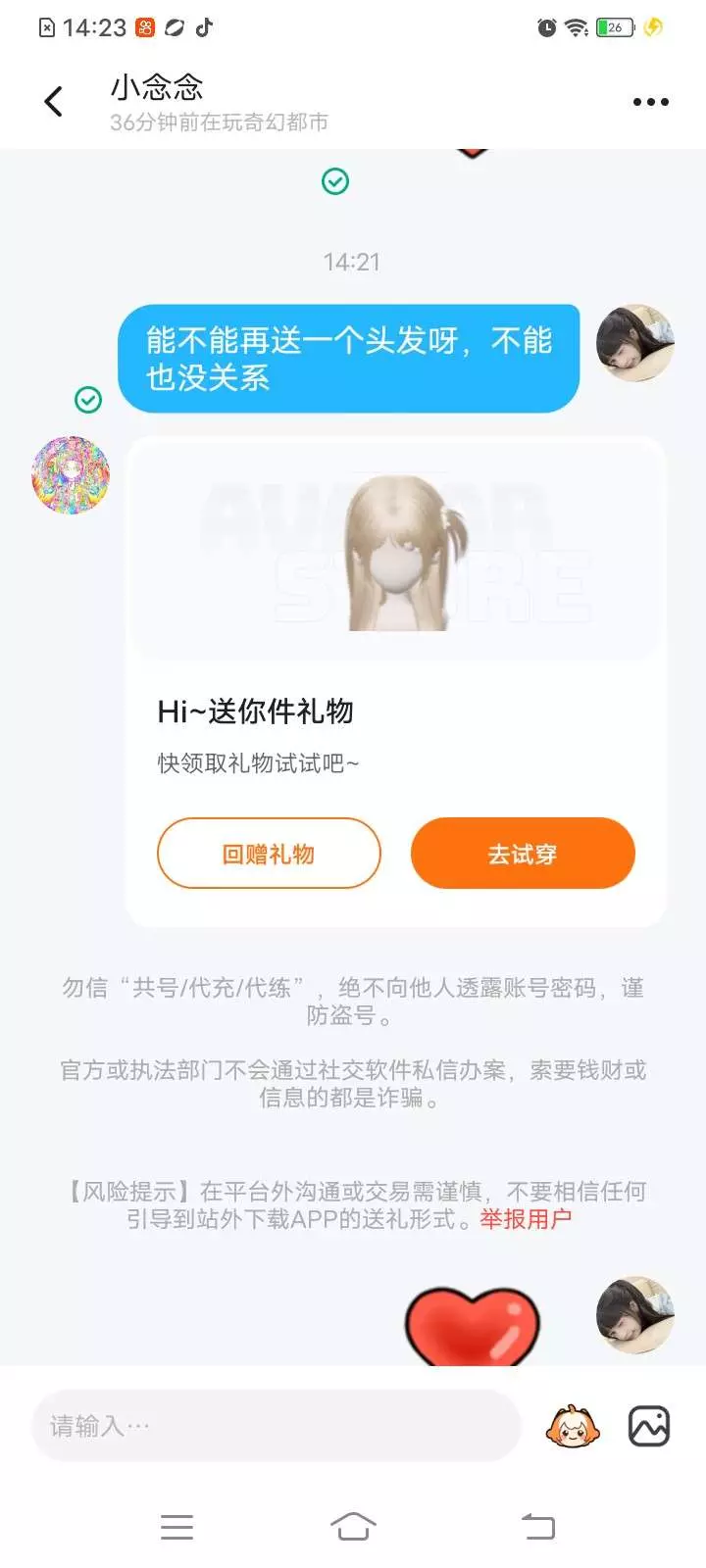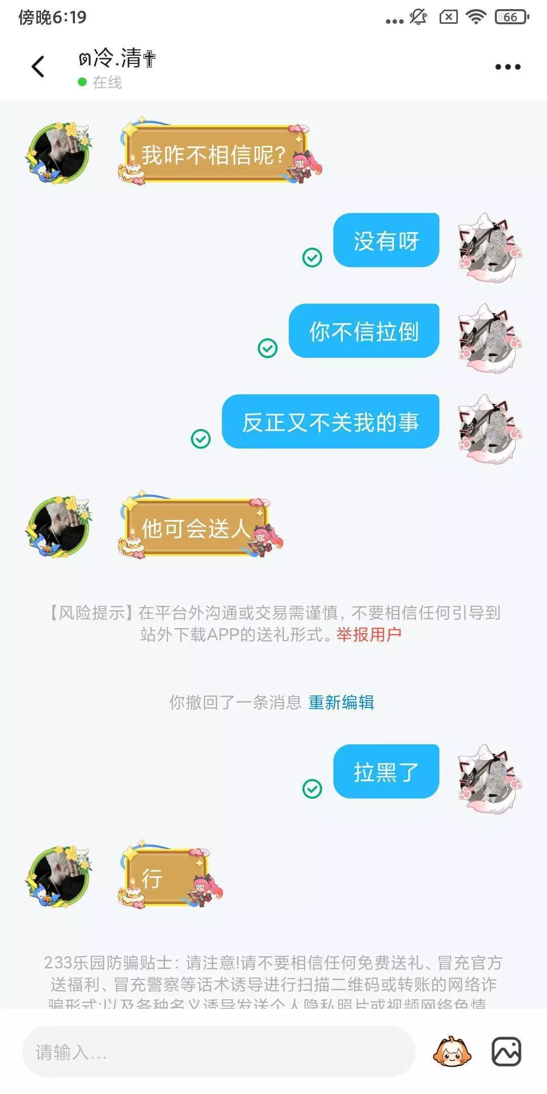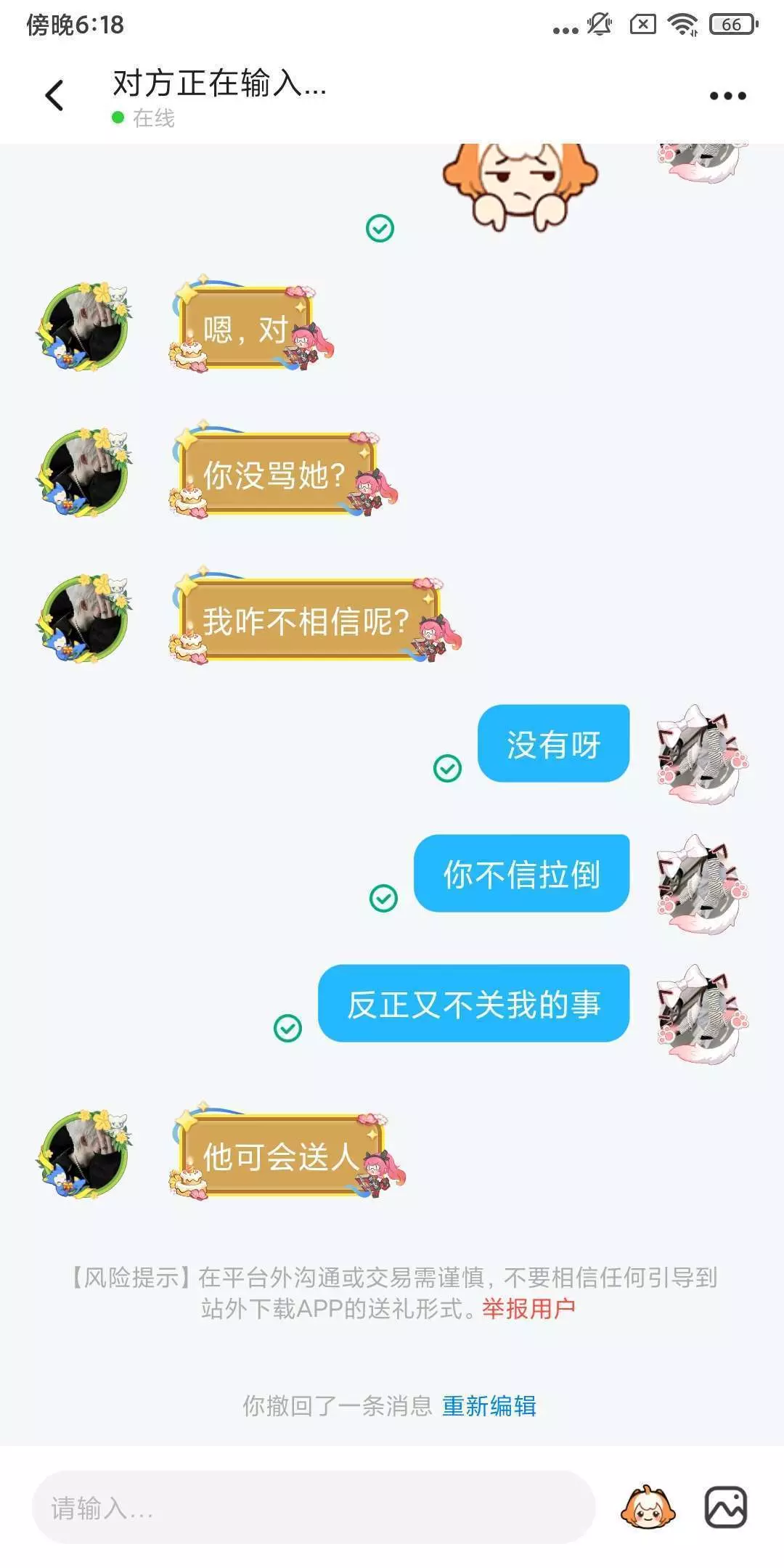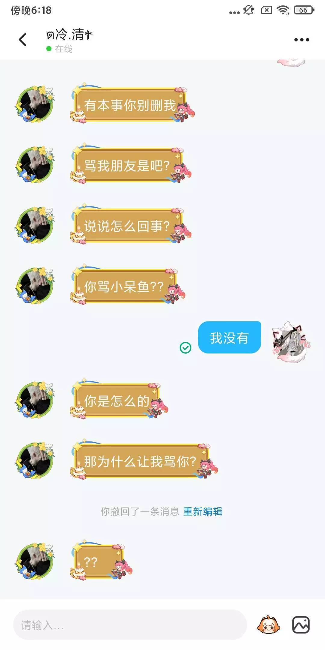 你们来看看这人,这人他有一个好友俩送我好友礼物,然后又然后那个人又说我好友骗他礼物了呀,然后他就叫他好友来加我好友骂了,我就想说一句,你不问清原因你就来骂人,你怎么能这样子呢?我跟你说我已经加你好友了,你给我等着