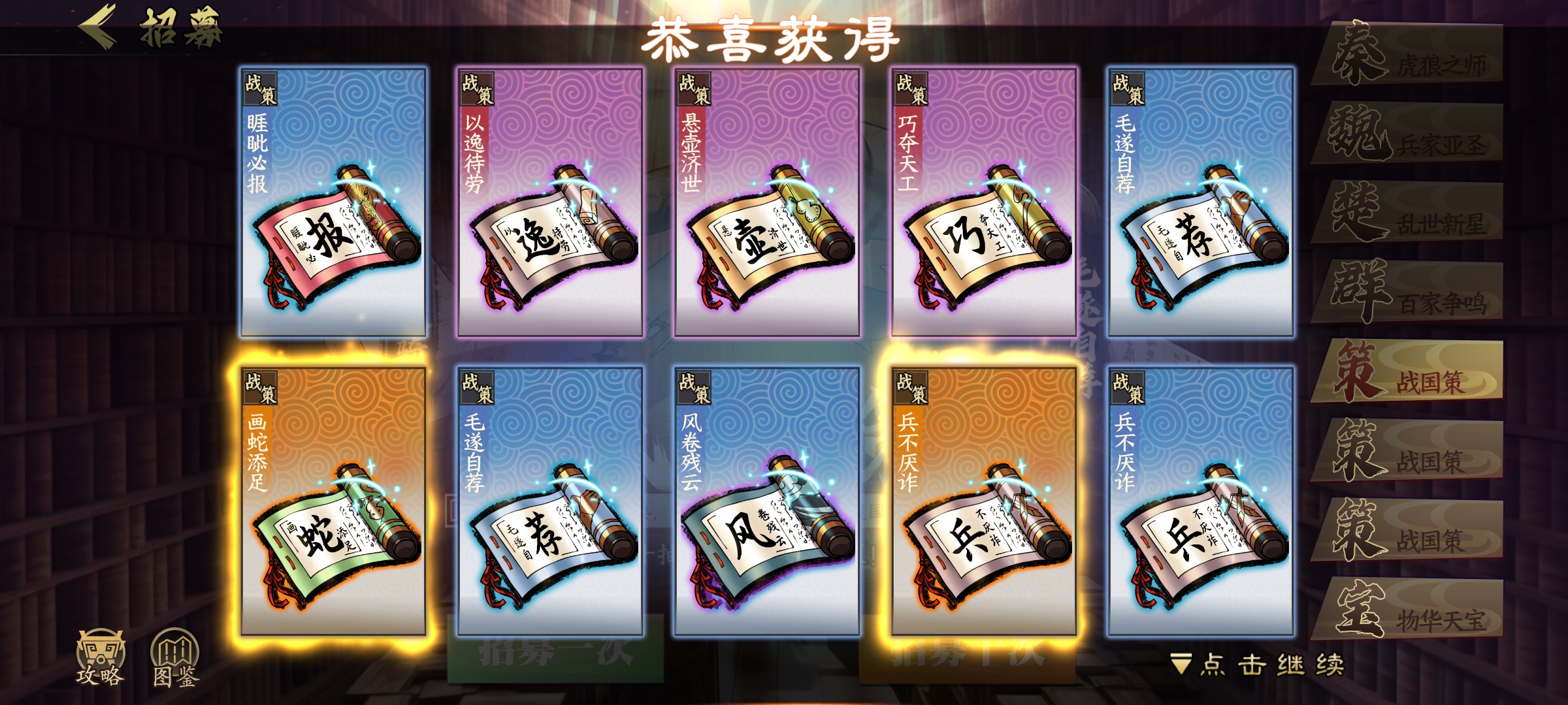 完成主线任务开启战策招募后,我们便能在战策招募界面抽取战策。