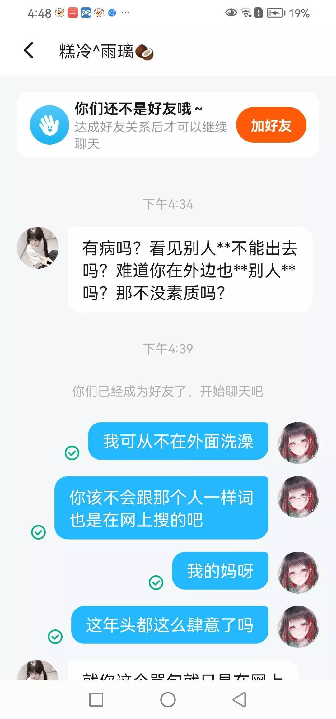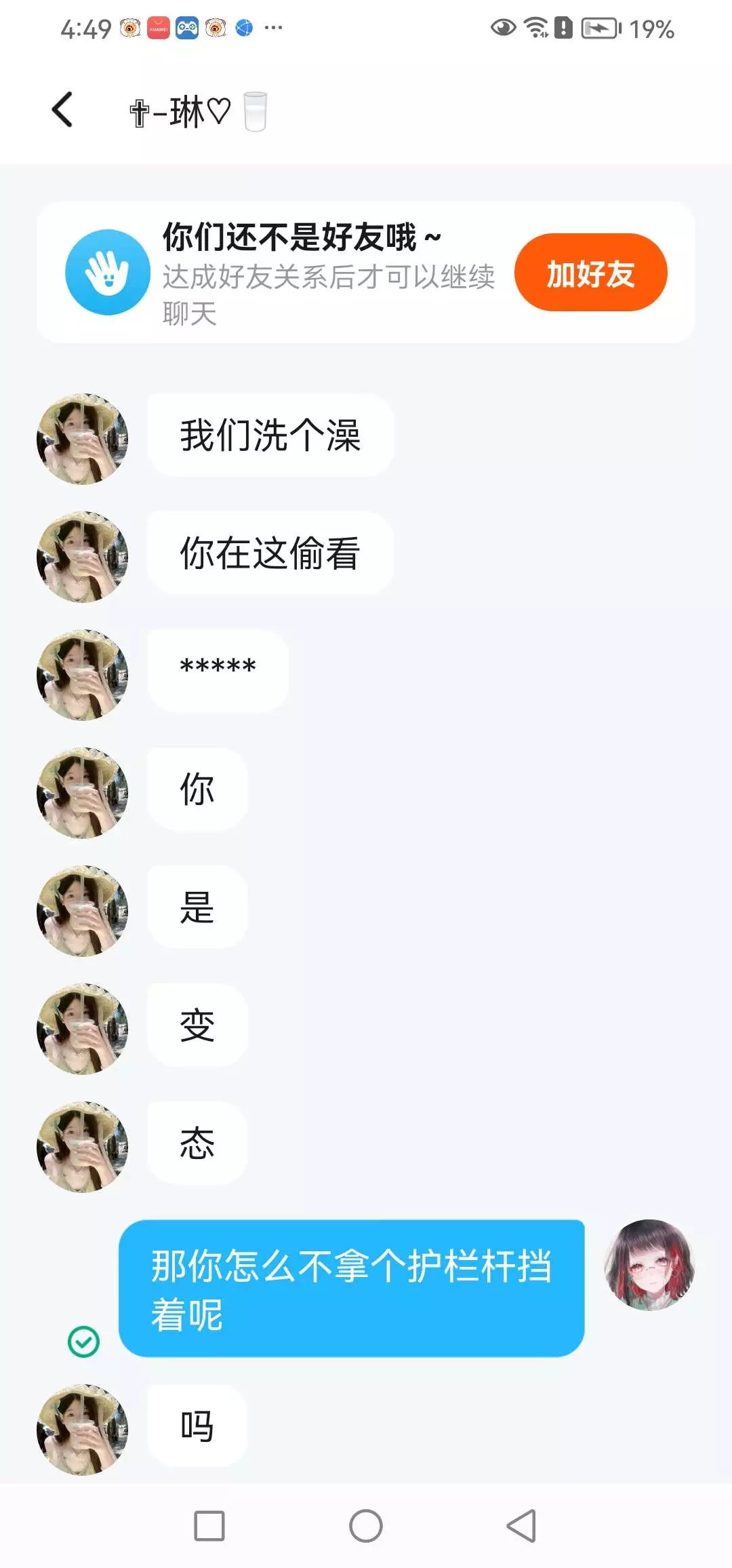 我在玩游戏那个浴室是公共场所然后那里也没有护栏然后我进去就看到她们两个了我啥也没说呀她俩就加起我好友来骂我好心情全被她俩毁了