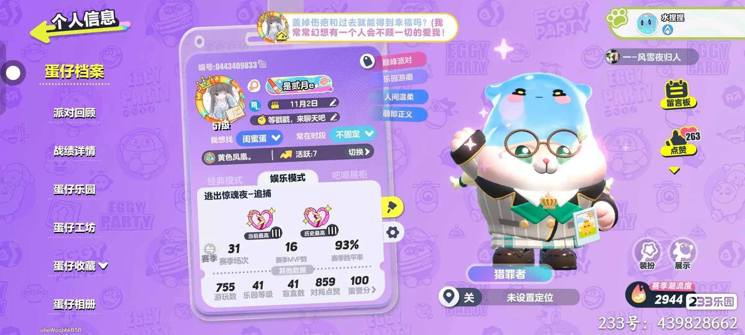 -游戏特色:你还可以设置你喜欢的主页!!你可以给自己换头像!写留言!让大家看到你的主页并点赞!!!在蛋仔中游玩的人们会陪伴着你,不让你感到孤独惆怅!!!还可以挂自己喜欢的人或宠物,让大家了解你!!😚
