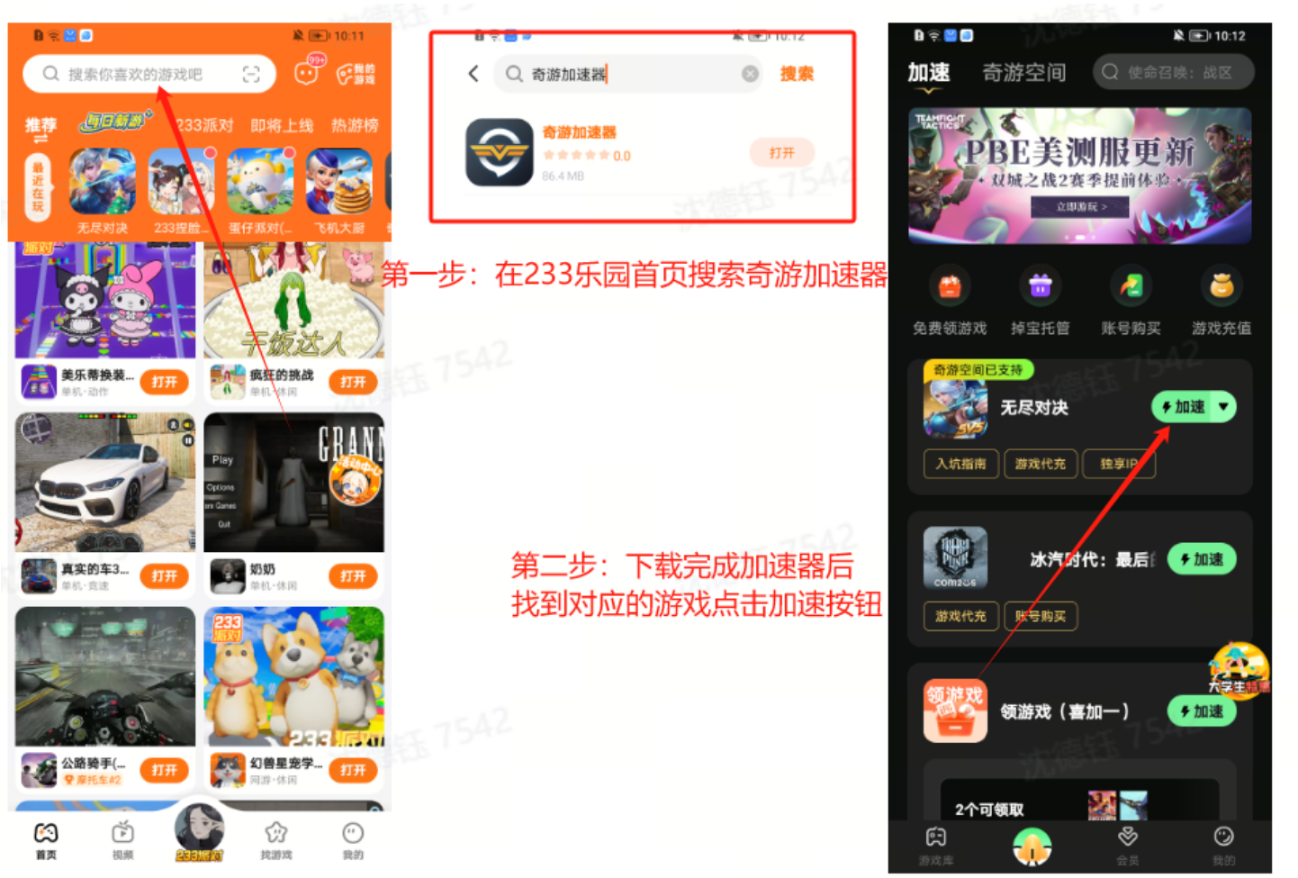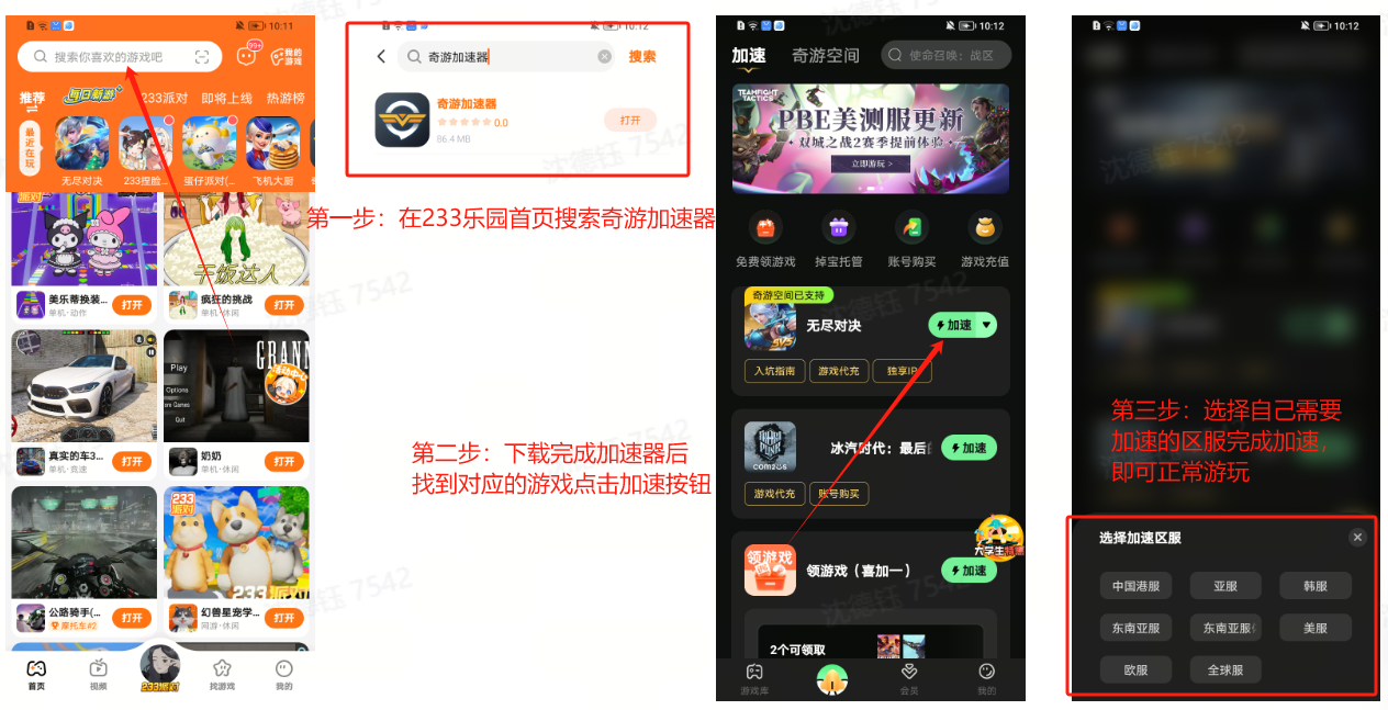第三步:打开奇游加速器,找到自己需要加速的游戏,点击加速,选择要游玩加速的区服,即可正常进入游戏游玩啦