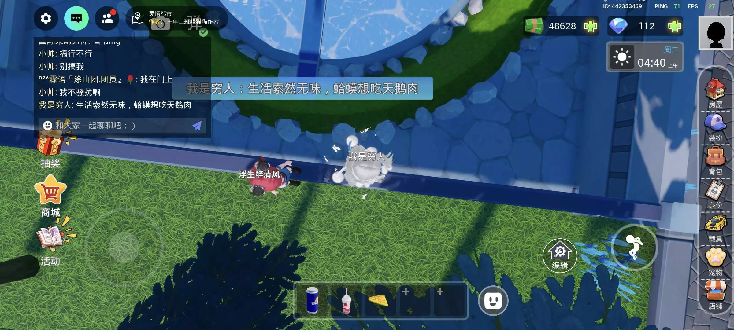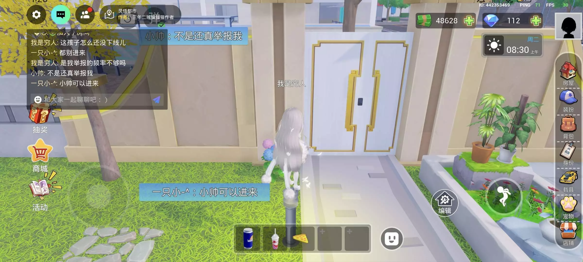 起因是我在这个灵雾都市买了一个大别墅,我就想着找几个舍友一起来住着这样的话热闹一些,然后就住进来了这个小帅,本来我在门槛上巡逻,看有没有半夜按门铃扰民的,然后发现评论里有一个租户说:小帅这是我的床!!当时我就跑到她住的那个房间嘛,发现这个玩意儿占人家床上还搁那儿跳舞,特地搞了一个半闭着眼笑的表情,我的妈呀,我去了一看这个家伙,然后他发现房主也就是我来了之后他就回自己房间了,然后我说警告一次,下次再骚扰别人就出去,他当时就是那么承诺,我不骚扰了,然后在这游戏里面的一天还没过,我就看见这个女租户又来说,当时我就萌生了一种不好的预感,觉得是小帅,然后我上去一看的确是这个东西,这次这个女租户直接从床上蹦起来反手给人家夹门后了,然后我就准备把他轰出去嘛,这娃死皮赖脸的不走,我就跟其他租户说,等会儿我驱逐全员,你们再过来,因为区都全员,所以小帅也在门口,还有一些不知道咋回事儿的,搁那儿站了一会儿才进去,导致小帅中途溜进去了,虽然我警告半天了,但是他还是趁我不注意一溜烟的窜进去,停都不带停的,我当机立断又把这个人驱逐出去了,,,,,