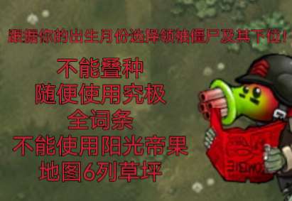 规则:暂停的僵尸以双倍出怪,禁止究极植物,禁止巨型植物,禁止大嘴花,只能种植4个植物